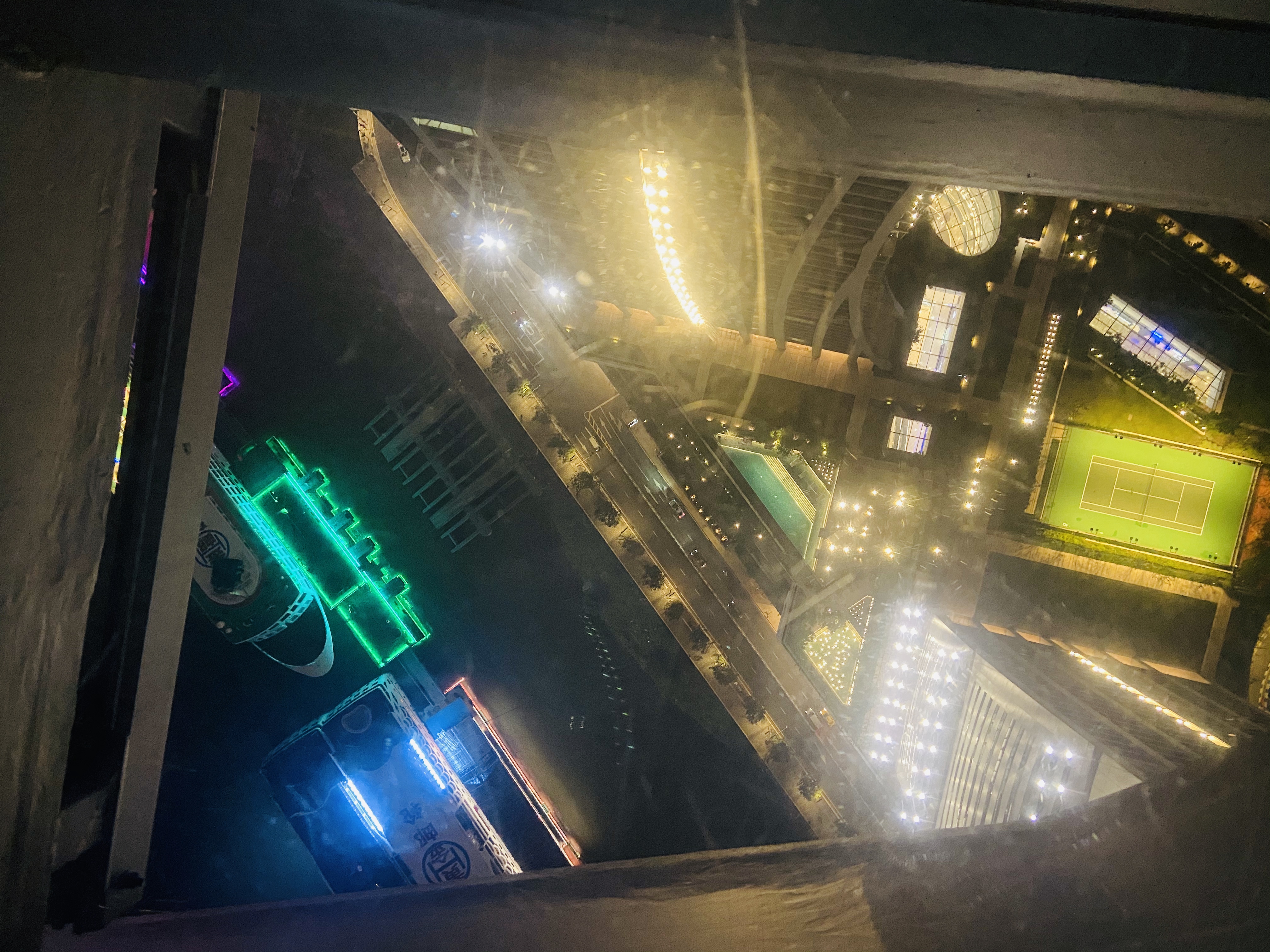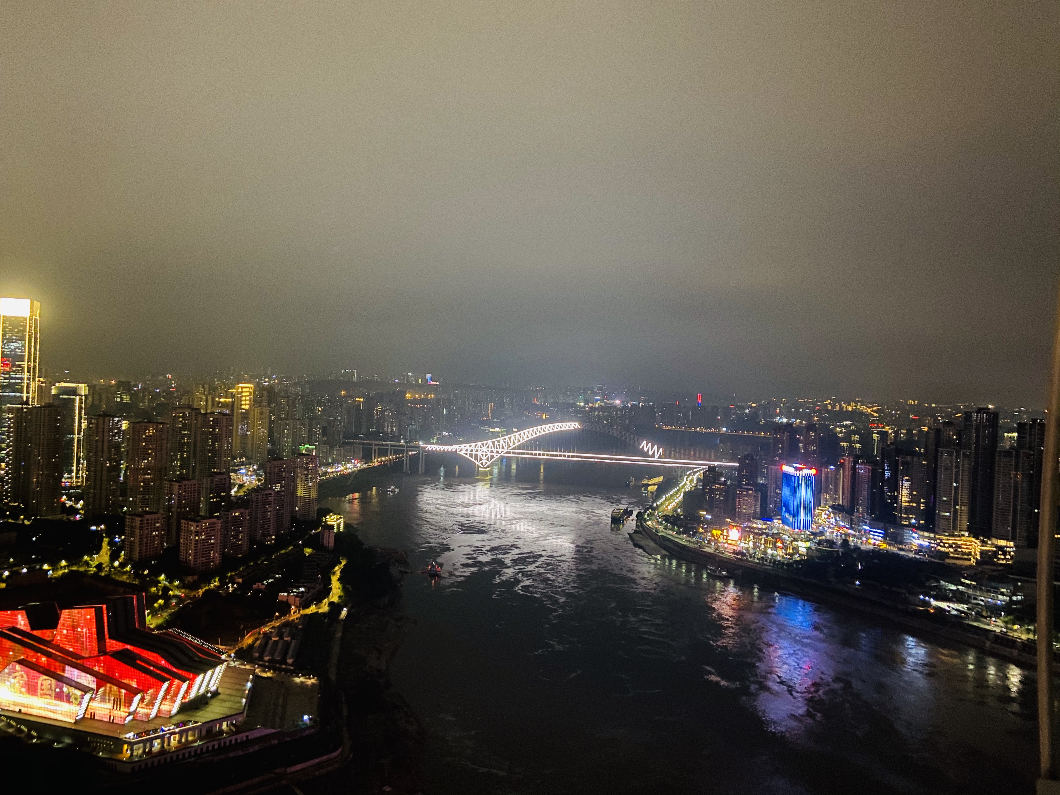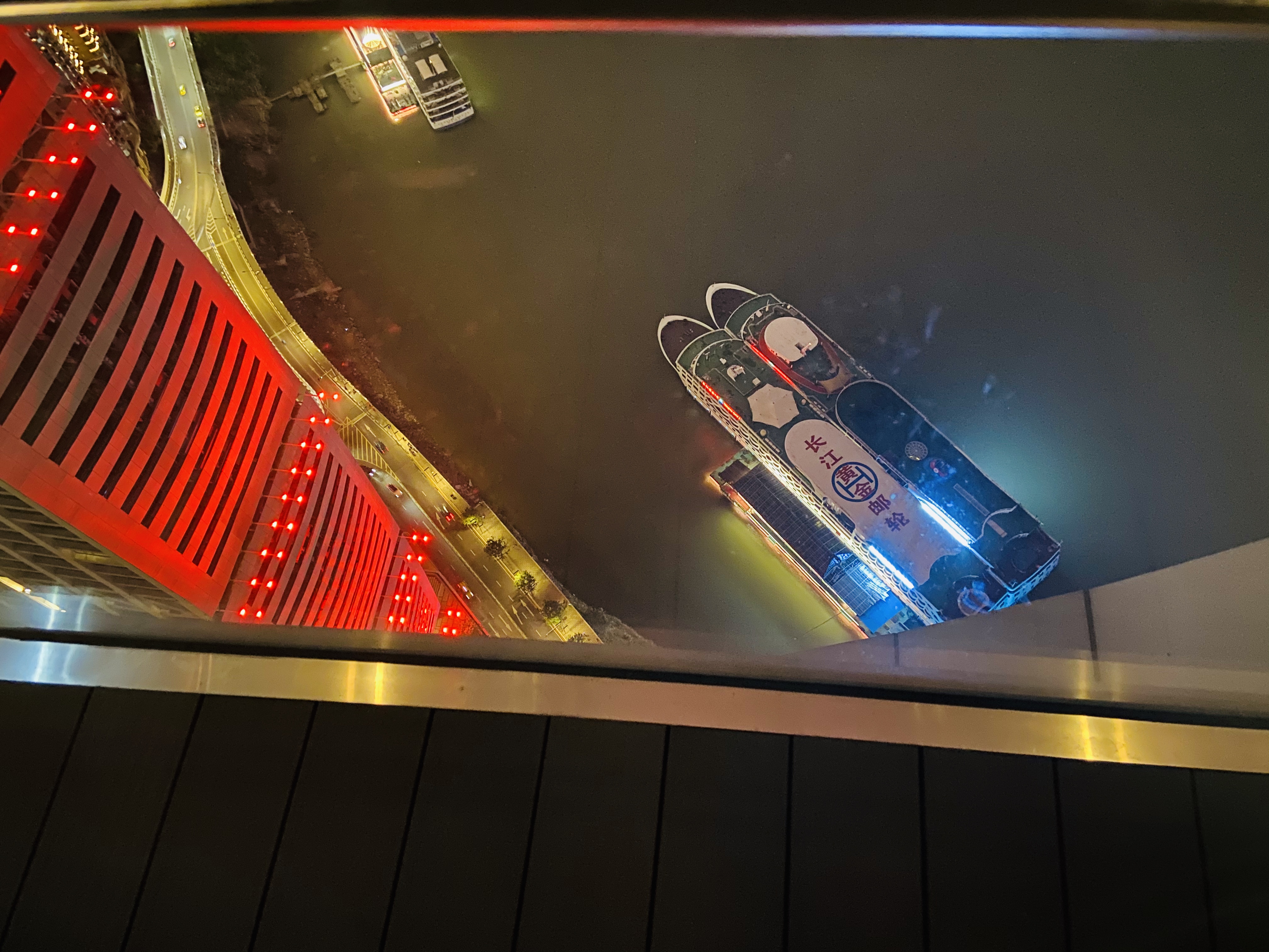 안내문만 보지 않았어도 이 환성적인 총칭의 야경을 더 즐겼을텐데, 유리 바닥이 너무 신경쓰여서 서둘러 보았다... 사진의 왼쪽에 보이는 화려한 건물들이 홍야동이다.