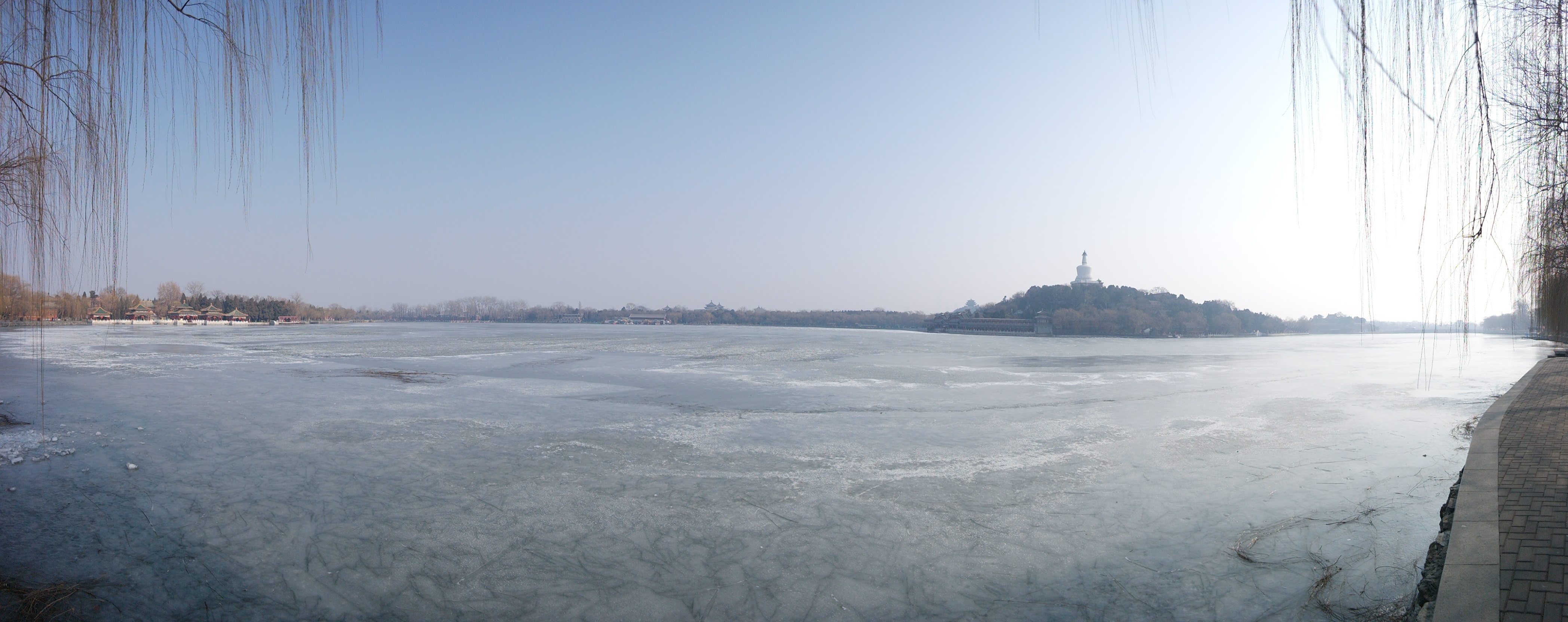 호수 저 멀리 남쪽으로 총화다오 섬 위에 있는 바이타오(白塔, 백탑)이 보인다.