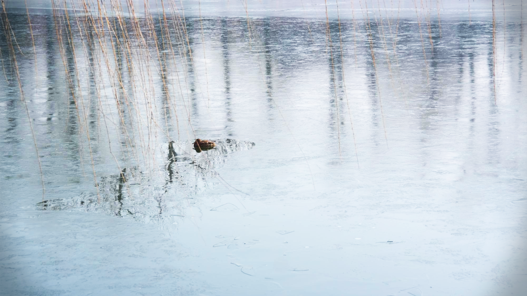 차갑게 얼어붙어 있는 호수를 유유자적하며 떠다니는 오리.