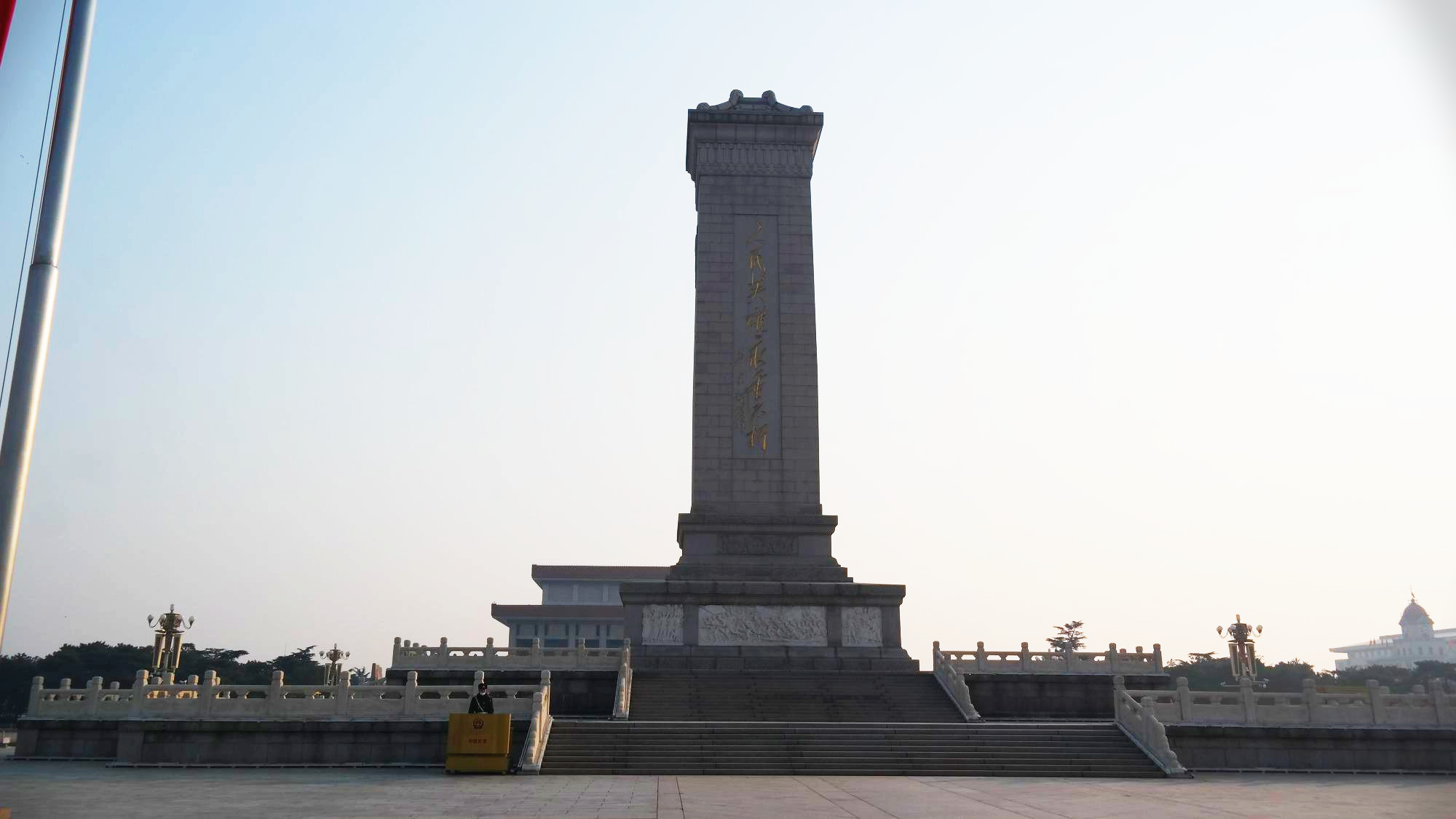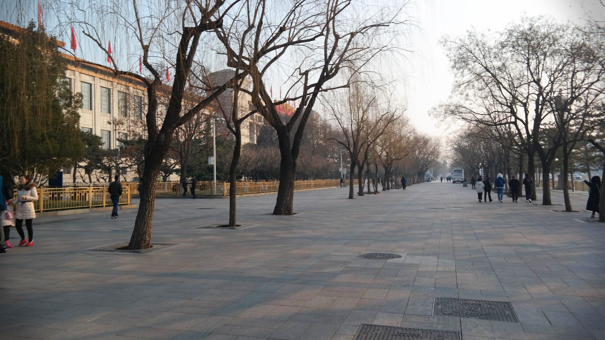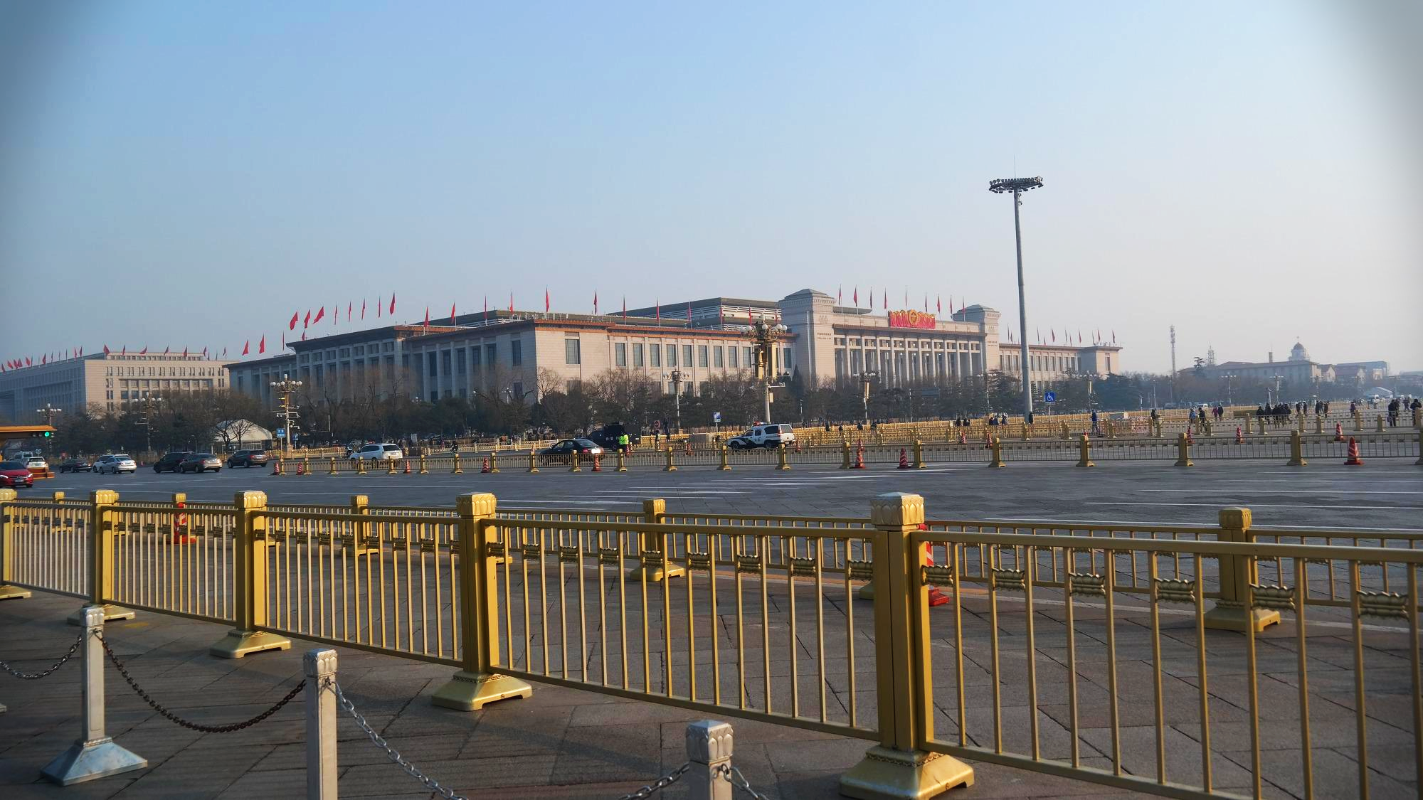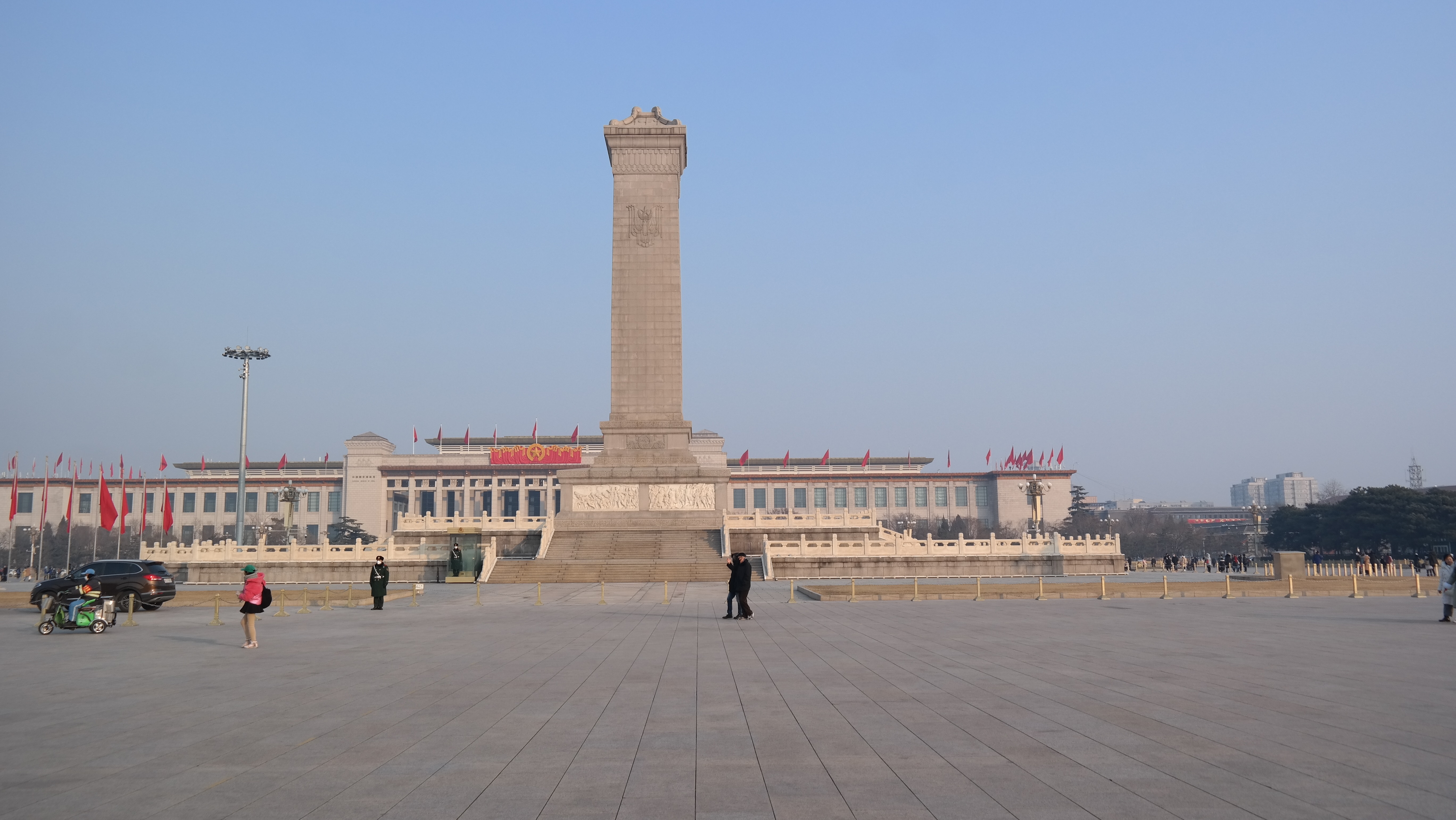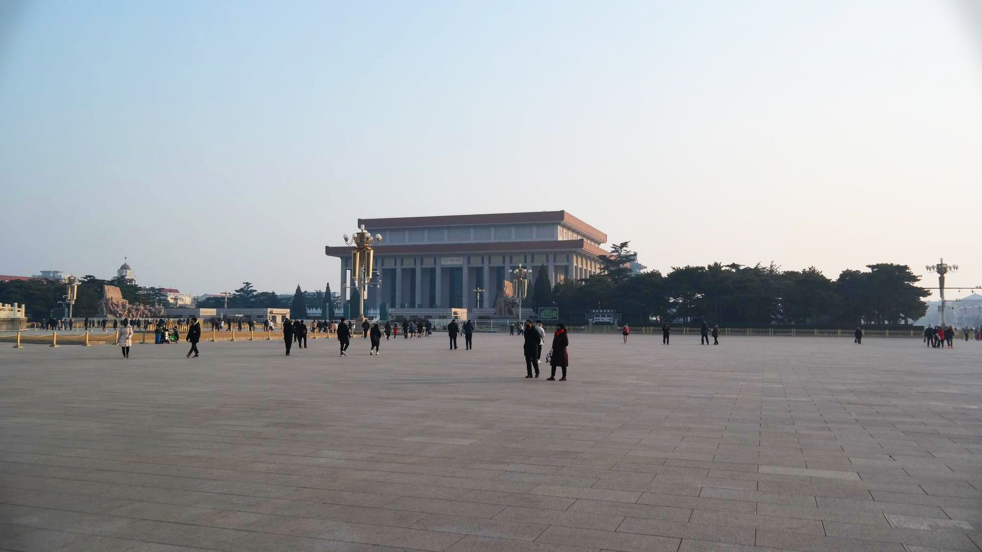 천안문에 바라보는 천안문 광장. 광장의 중앙에는 인민영웅기념비(人民英雄紀念碑)가 있으며, 동쪽(사진의 왼쪽)에는 중국의 국립박물관인 중국국가박물관(中国国家博物馆)이 있으며, 서쪽(사진의 왼쪽)에는 유명한 전국인민대표대회가 열리는 인민대회당(人民大会堂)이 있다. 광장의 남쪽(사진 속 기념비 뒤로 보이는 건물)에는 마우쩌둥기념당(毛主席紀念堂)이 있는 등, 정치력으로 가득차 있는 공간이다.