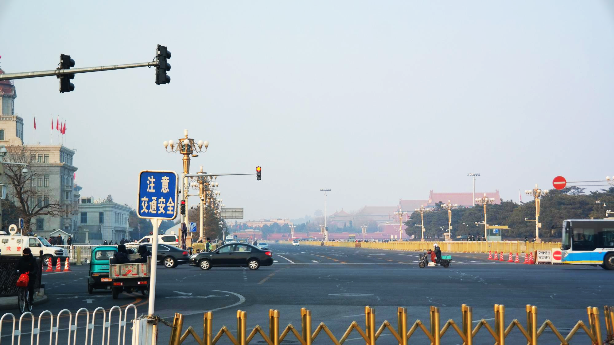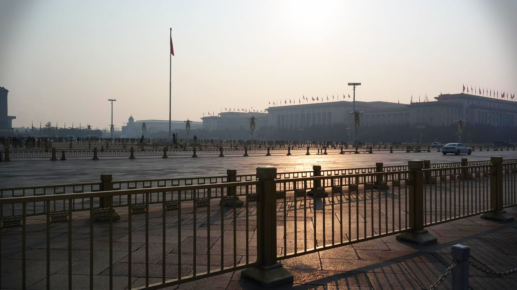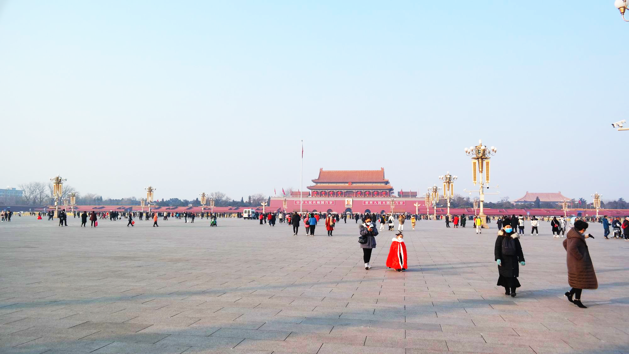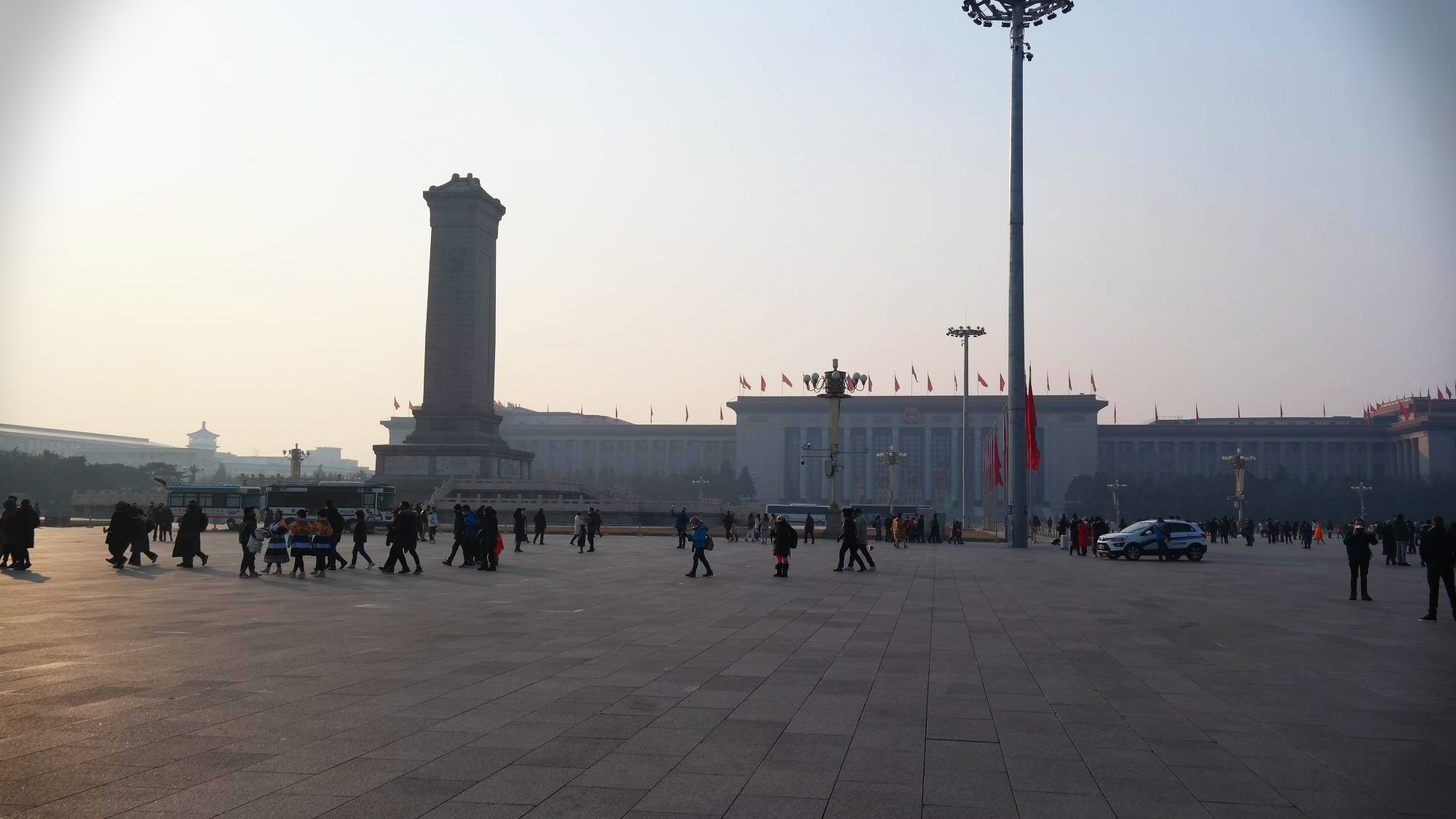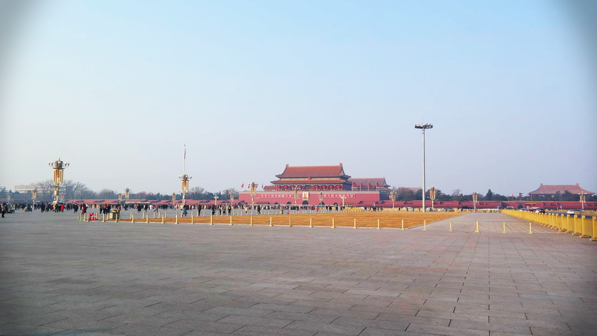 천안문에 바라보는 천안문 광장. 광장의 중앙에는 인민영웅기념비(人民英雄紀念碑)가 있으며, 동쪽(사진의 왼쪽)에는 중국의 국립박물관인 중국국가박물관(中国国家博物馆)이 있으며, 서쪽(사진의 왼쪽)에는 유명한 전국인민대표대회가 열리는 인민대회당(人民大会堂)이 있다. 광장의 남쪽(사진 속 기념비 뒤로 보이는 건물)에는 마우쩌둥기념당(毛主席紀念堂)이 있는 등, 정치력으로 가득차 있는 공간이다.