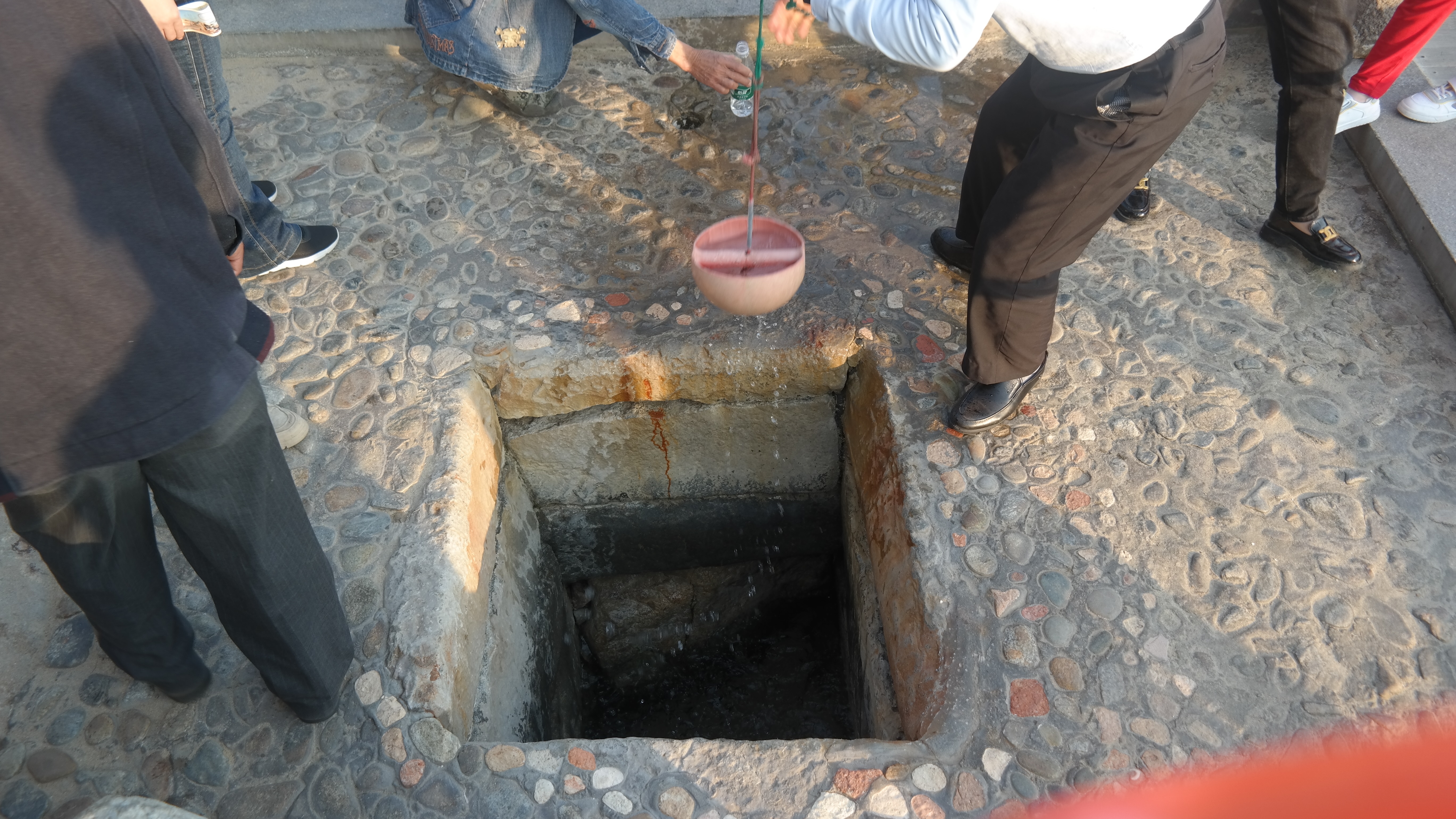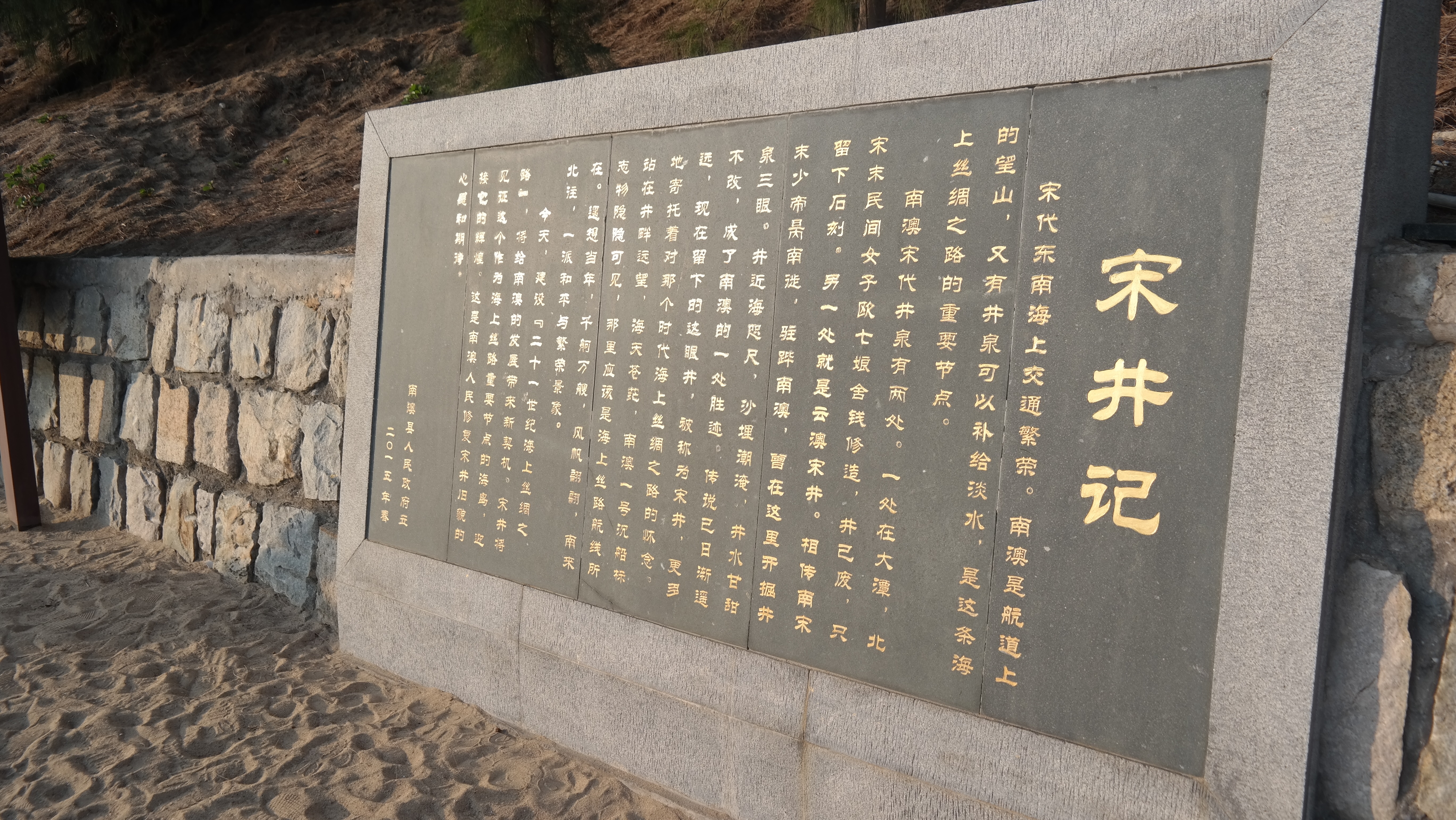 모래사장 한 가운데 우물이 있다. 관리자분이 있어서 물을 길어 주고 있는데, 마실 수 있다고 한다. 송정(宋井)이라는 이름에서도 알 수 있듯이, 이는 송나라 시대에 만들어진 우물이다. 정확하게는 남송 시대에 만들어졌다. 중국 대륙에 북쪽은 금나라, 남쪽으로는 남송이 있던 시기에, 몽골에 의해 멸망하게 된 금나라 이후, 몽골과의 조약을 어긴 남송과 몽골과의 44년 동안의 대대적인 전쟁이 벌어져 1276년항저우가 몽골에 함락되어 남송의 왕이 이곳까지 피난을 오게 되었다고 한다. 남오섬은 당연히 작은 섬이니 물이 부족하자 당시에 이 곳에 세개의 우물을 팠다고 한다. 각각 임금을 위한 용정(龙井), 장군과 관료를 위한 호정(虎井), 병사들을 위한 마정(马井)이라고 불렸는데, 그 중 하나만 발견되었고 나머지 두개는 아직도 못 찾고 있다고 한다. 밀물시기에는 우물이 바다에 가라앉는데, 신기하게 우물에는 짠맛이 없다고 한다.