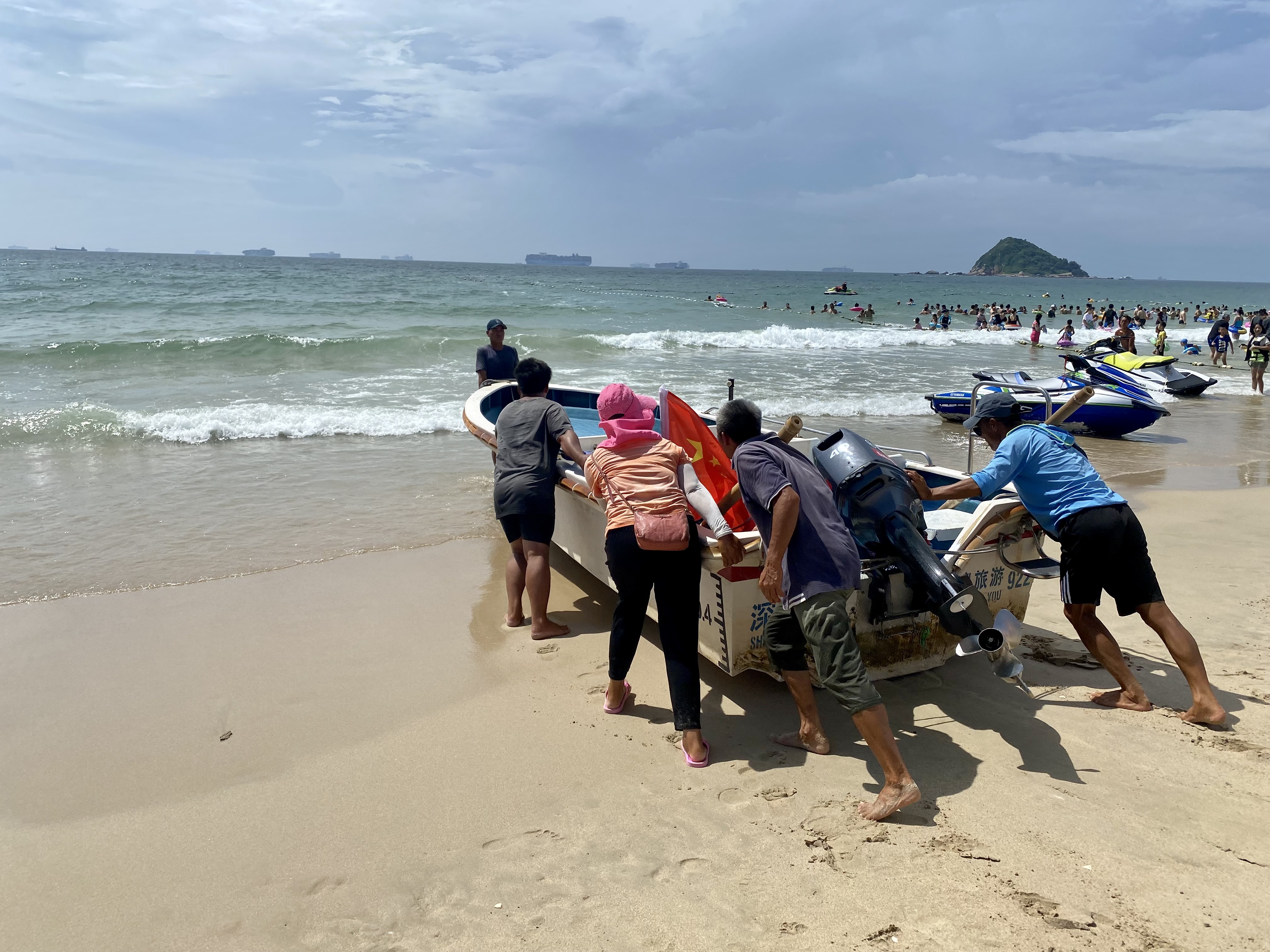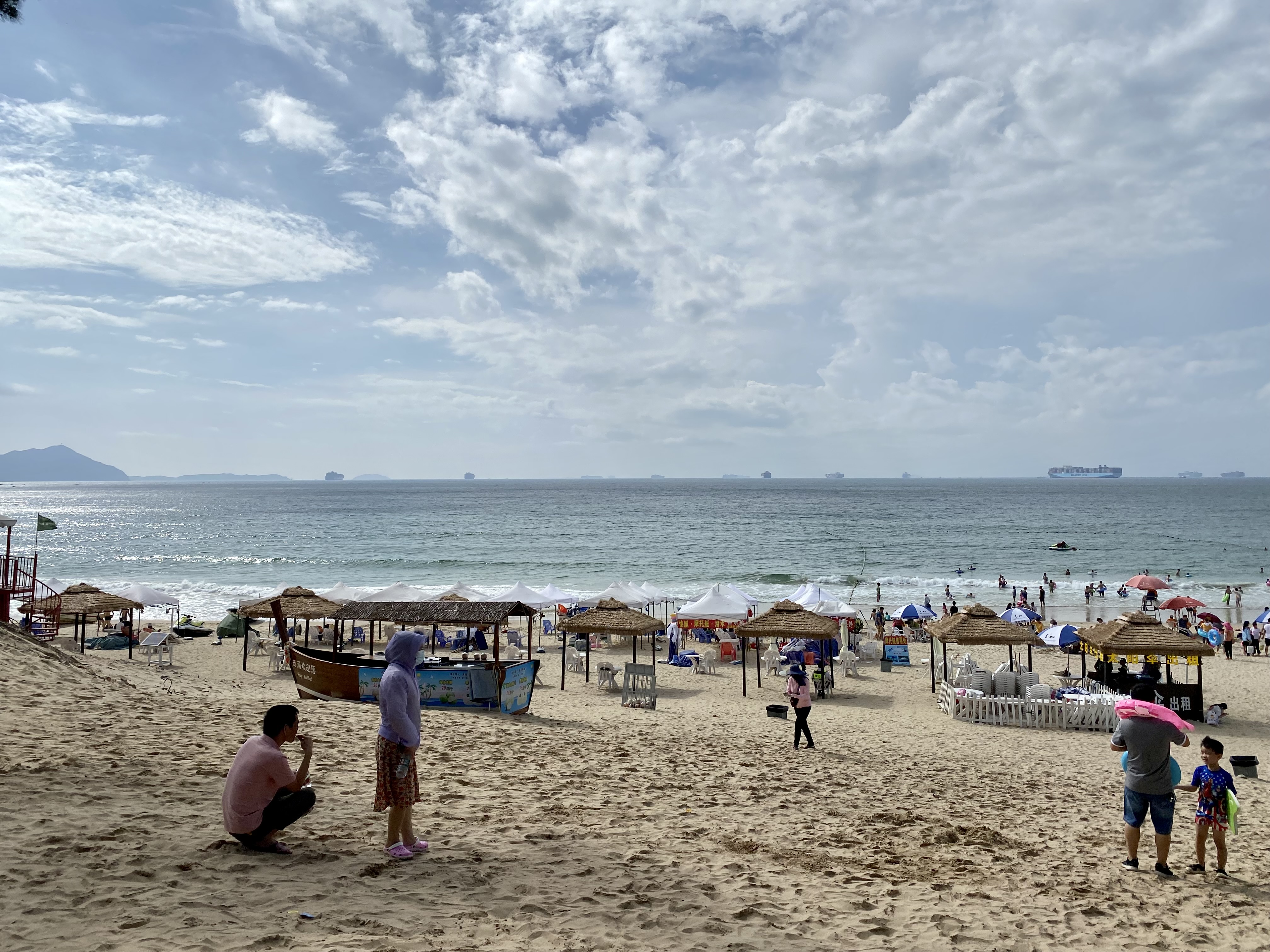 해변의 입구가 가까워지자 좁은 왕복 2차선 도로에서 얽키고 섥킨 차들로 인해서 한참을 기다린 후에야 해변 입구에 도착하였다. 특이하게 심천의 해변들은 입장료가 있다. 주차비용은 별도. 주차장이라고 해봤자, 흙바닥의 공터이다. 해변의 입구에서 해변까지 거리가 꽤 되니 차를 가지고 오는 것이 편하다. 가까운 호텔이나 민박까지도 거리가 꽤 된다. 주차장에서 10m정도 걸으면 바로 나오는 해변. 중국의 해수욕장에서는 한국의 해수욕장에서는 보기 힘든 대형선박들이 자주 보인다. 생각보다 사람이 별로 없다