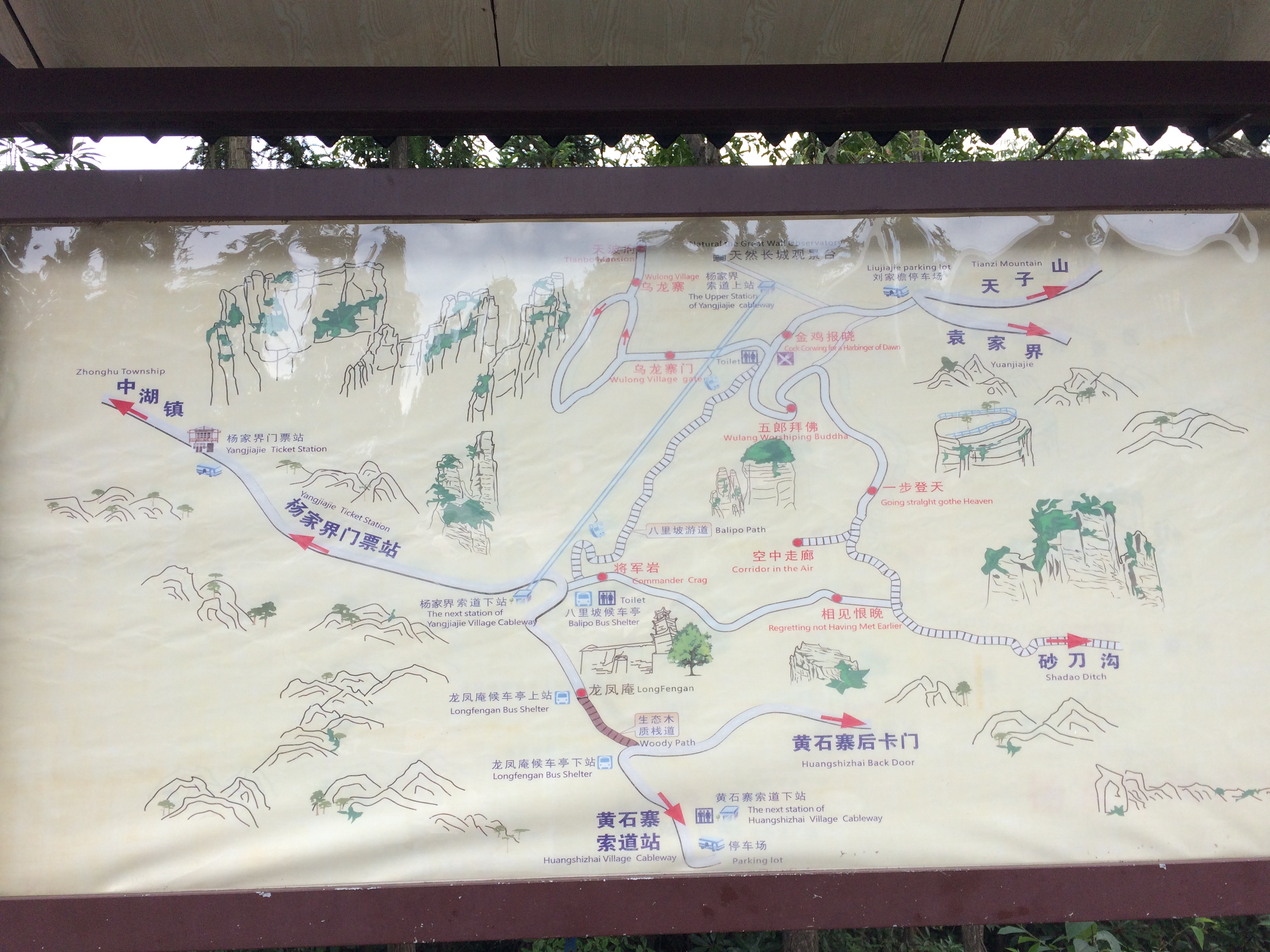 셔틀버스가 양가계 정류장에 내려주면, 이곳에서 양가계를 관람할 수 있는 몇가지 길을 선택할 수 있다. 가장 편하고 빠르게 볼 수 있는 방법이 케이블을 타고 내려오는 방법이다. 걸어서 내려오는 방법은 두 코스가 있는데, 하나는 빠른 길로 내려오는 방법이고 다른 하나는 계곡과 산들 사이를 꼬불꼬불 걸어서 내려오는 방법이다. 케이블카를 타게 되면 너무 빨리 끝날 것 같고, 이 절경의 돌기둥 사이를 돌아다녀보고 싶어 우린 굽이굽이 길을 걸어 내려오는 방법을 택하였다.