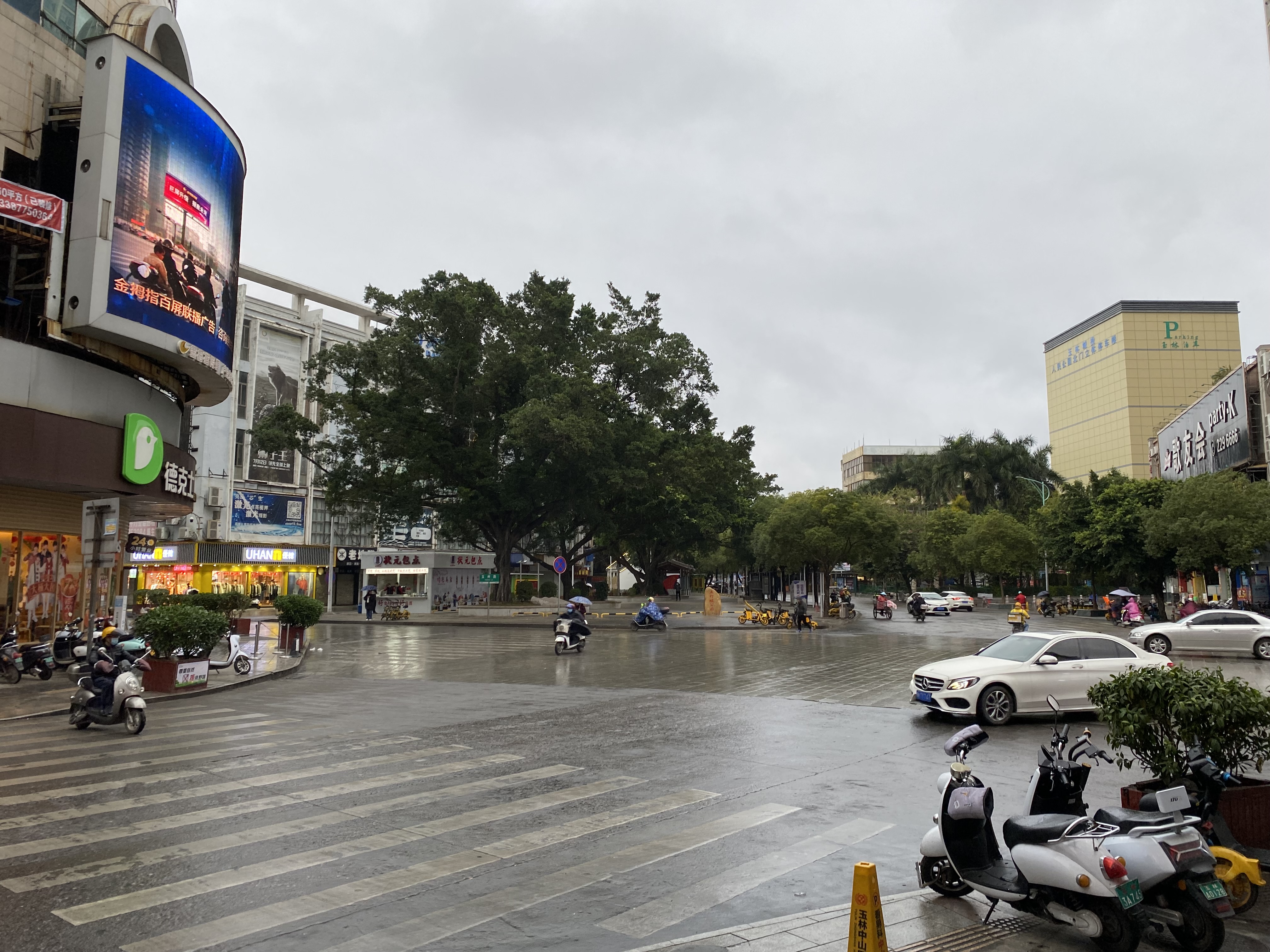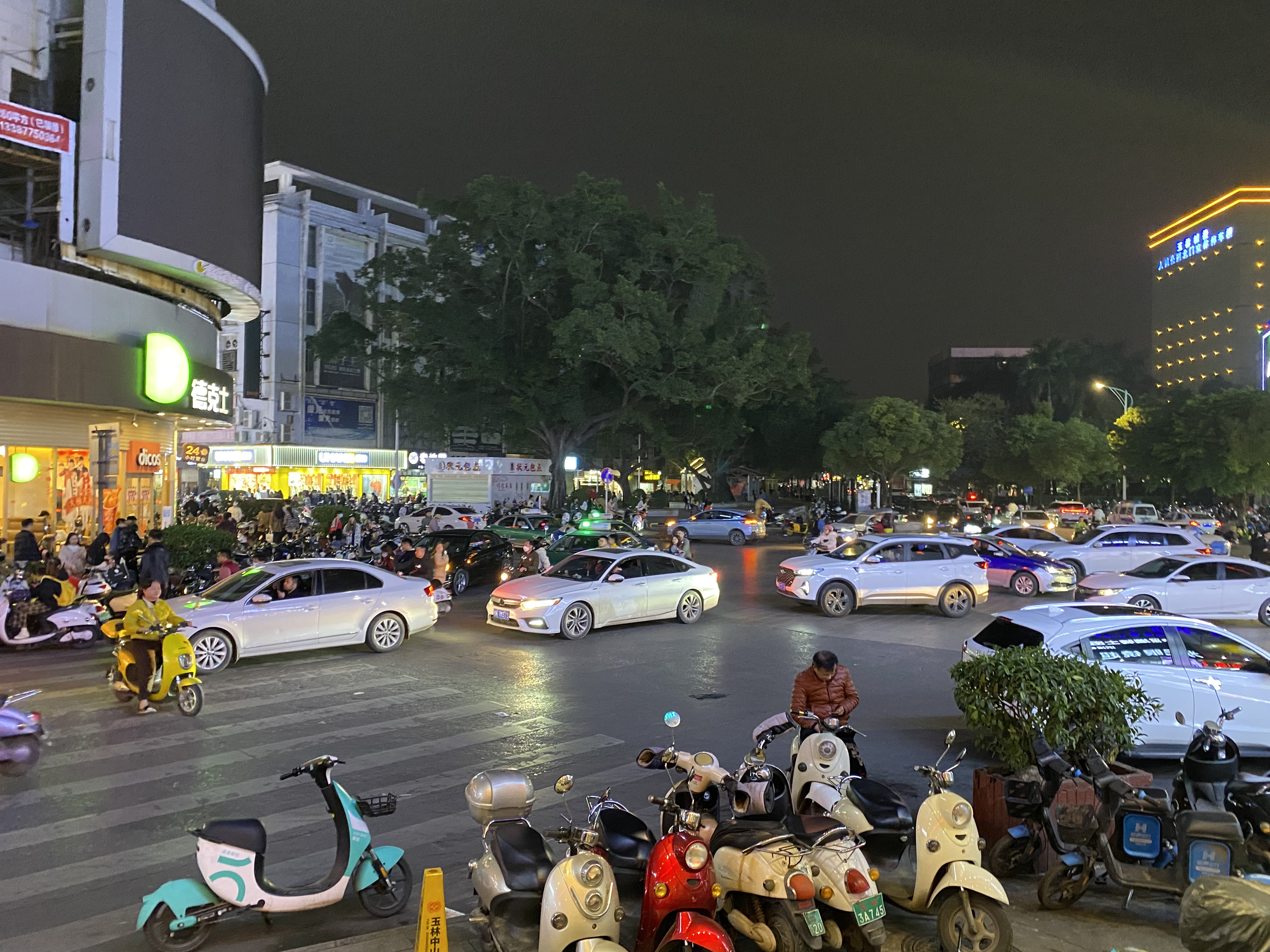 시간이 지나자 그나마 많이 좋아진 교차로. 추운 날씨에도 전동스쿠터가 굉장히 많았다. 근처에 옥림시 인민공원(玉林市人民公园, 위린스 른민공위엔)이 있어 산책을 하고 다른 곳들을 걸어가 보았으나, 강아지를 산책하기에는 딱히 좋지 않은 도시라 가볍게 산책을 하고 다시 호텔로 돌아왔다.