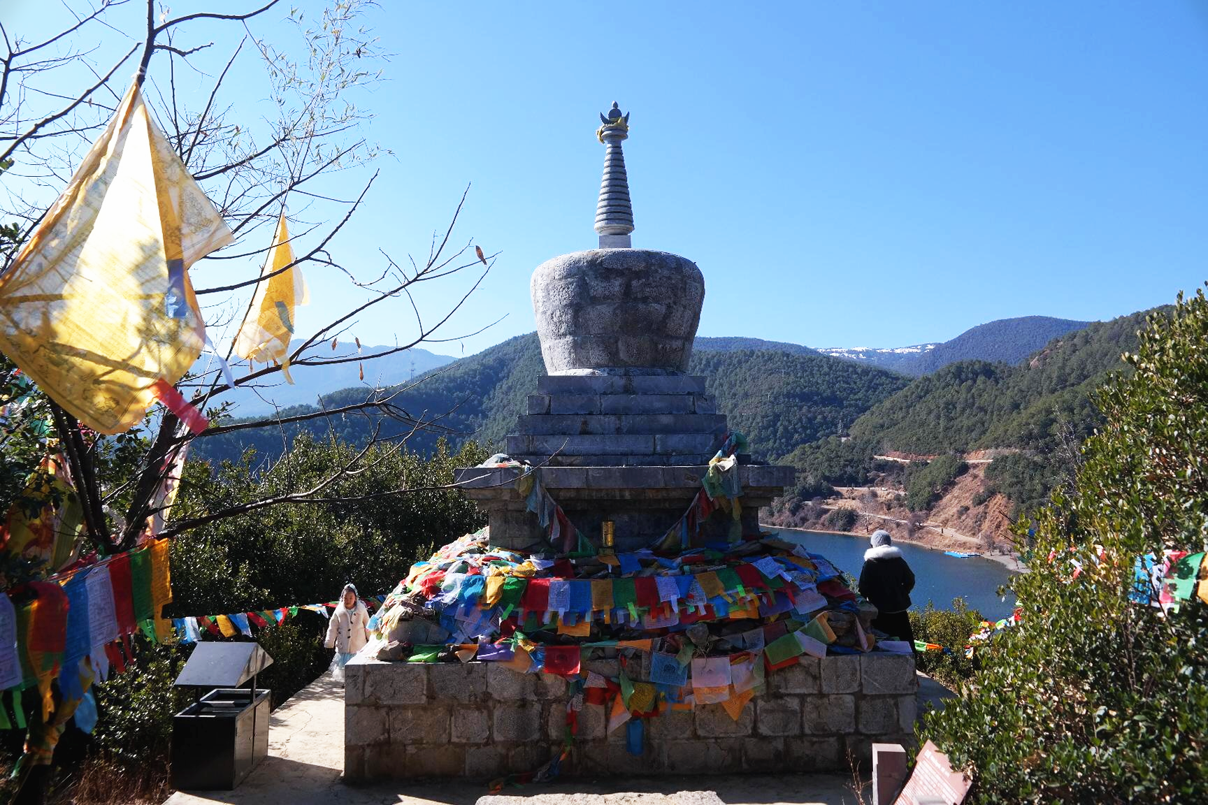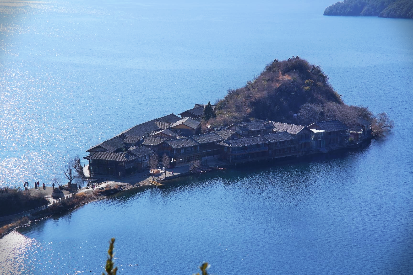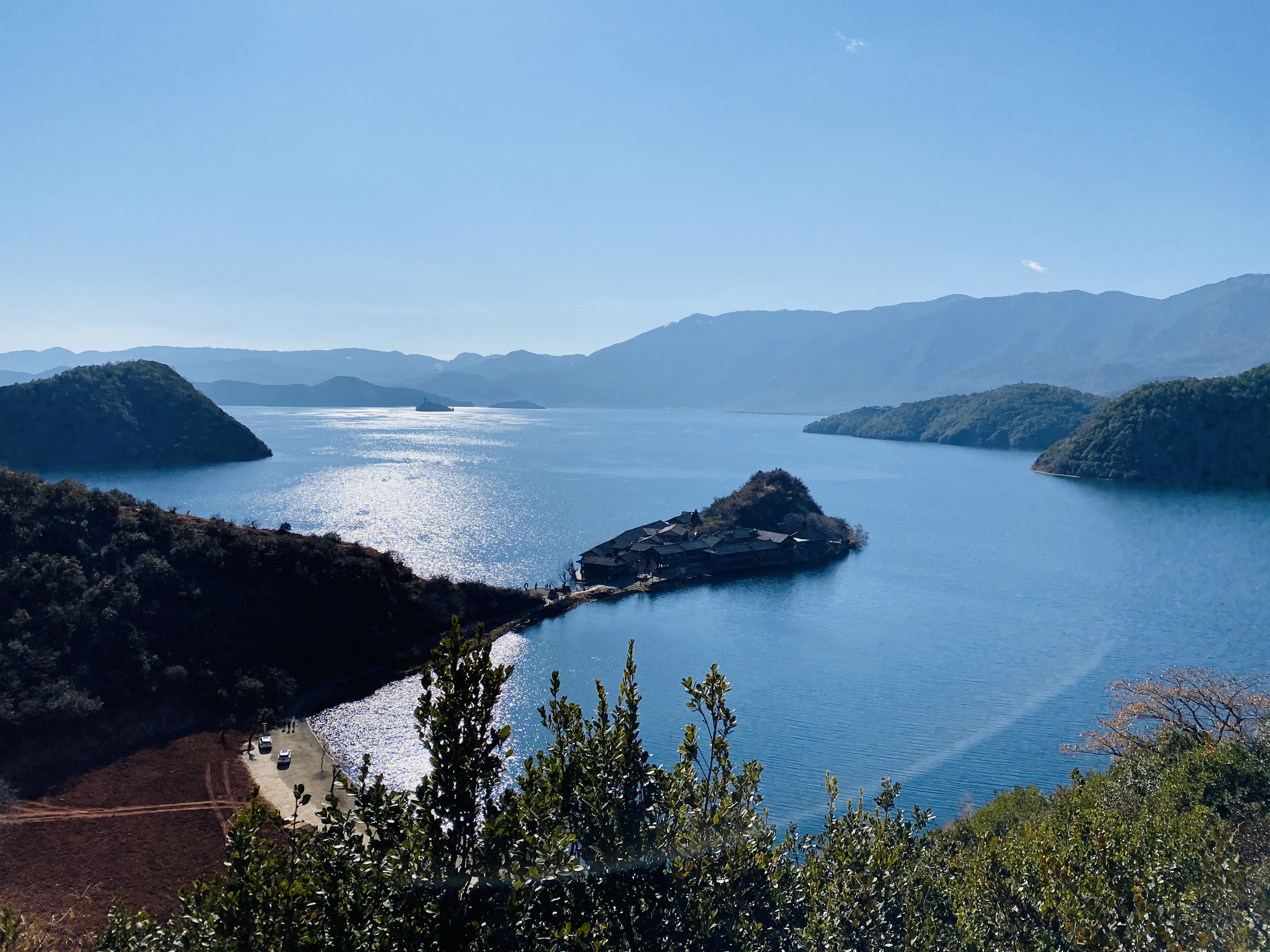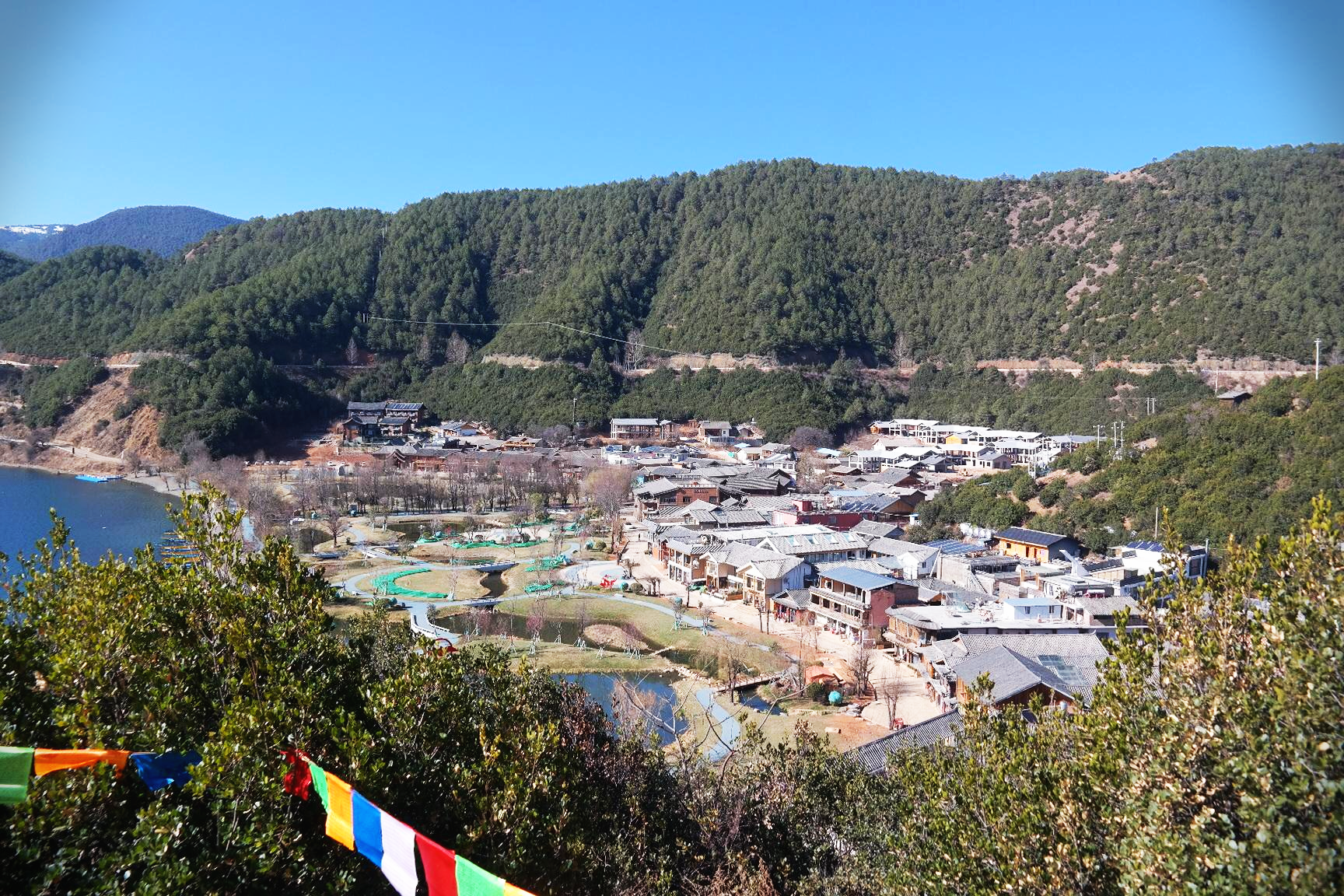 새파란 하늘아래에서 그 새파람을 반사시키는 투명한 호수 위에서 거무뉴션(格姆女神, 격무여신)이 흘린 눈물같은 모양을 하고 있는 너무나도 극적으로 생긴 이 반도는, 그 풍경만으로도 거무 여신의 눈물이 만들어낸 호수라는 전설의 중심에 서 있는 마을인 것이다. 우리도 호수 주변을 차로 천천히 돌면서 구경하다가 창밖으로 펼쳐진 이러한 경치에 이끌려 차를 세워 구경하기로 하였다.