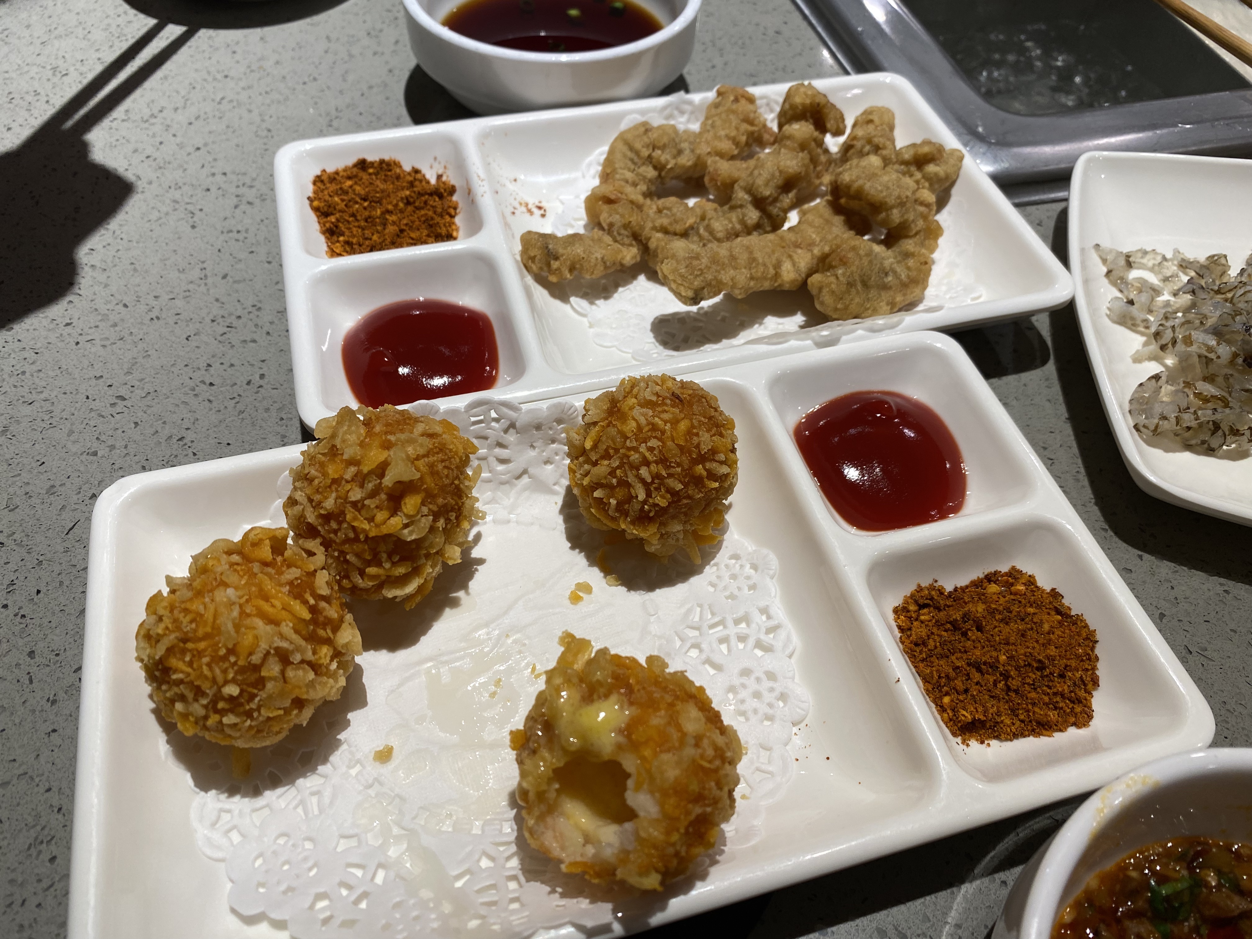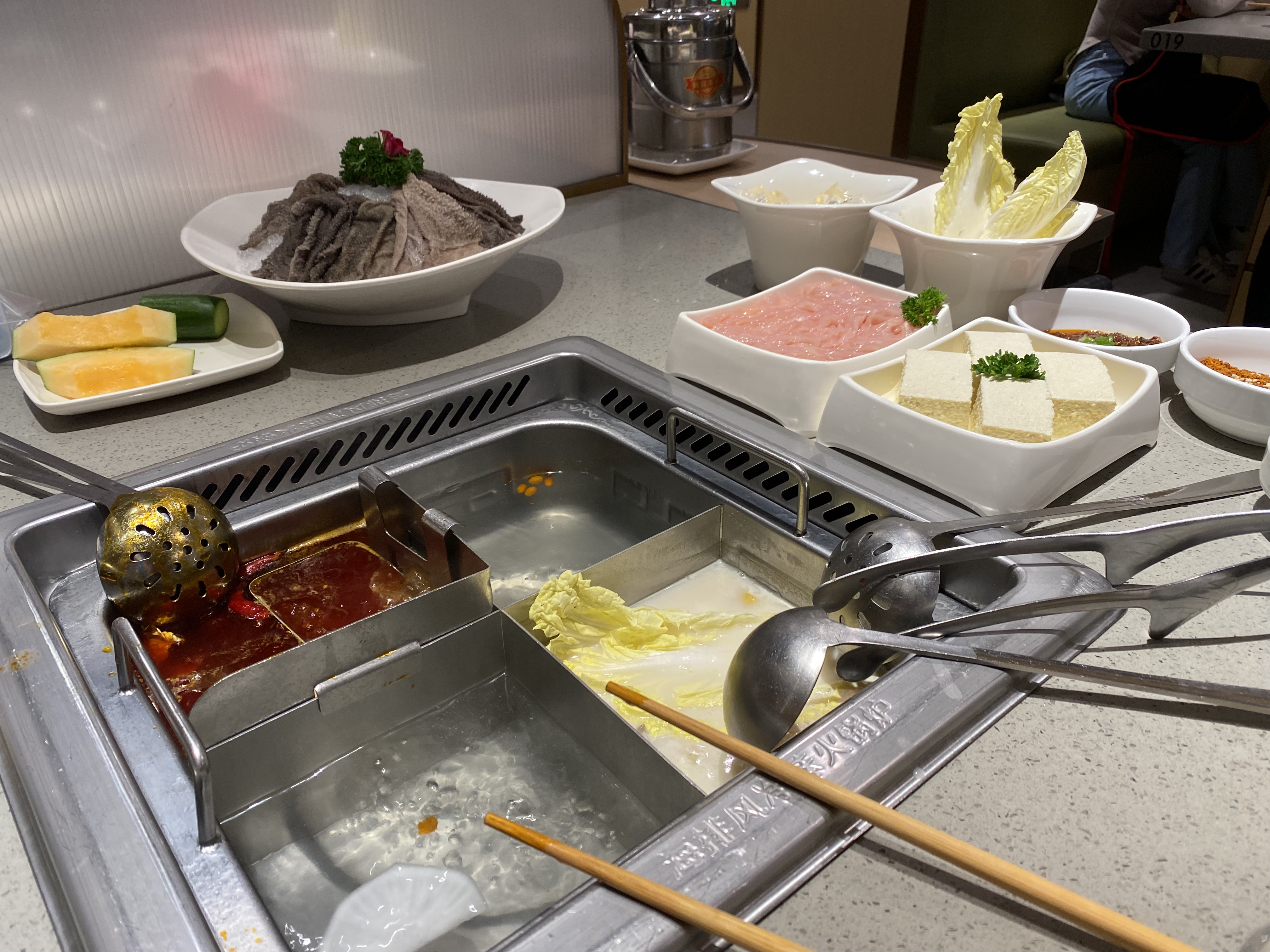 탕으로는 일반 훠궈탕과 닭고기 육수탕(닭고기와 돼지 내장이 들어가 있다)을 시켰다. 탕에 데쳐먹는 것으로는 소고기, 배추, 거위 내장, 두부, 감자 등을 시켰고, 반찬으로는 물고기 껍질, 치즈볼, 탕수육을 주문하였다. 종류는 많지만 훠궈집에서 나오는 음식은 양이 그렇게 많지 않다.