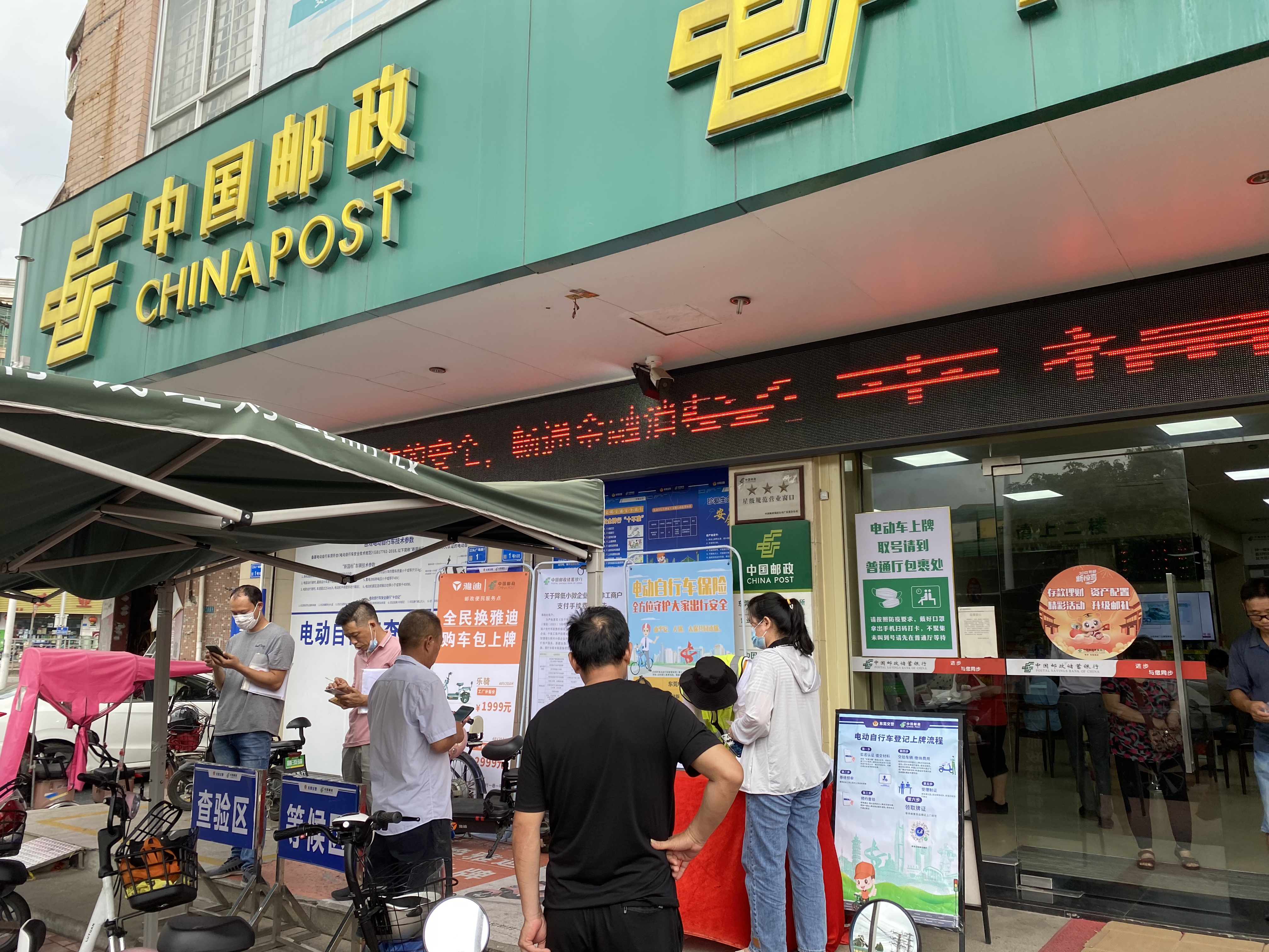 그래서 전기자전거를 등록하기 위해서는 도면과 똑같이 복구를 해놔야 하고, 사실상 이건 편법인 듯 하다. 그래서 전기스쿠터를 구매한 매장에서 소개해 준 등록지점에 가야지만 등록을 할 수 있고 다른 곳에 가면 등록이 안된다고 하였다. 전기 자전거 등록소는, 전기자전거가 멀리 갈 수 없기 때문에 거의 20km 거리마다 있는 듯 한데, 중국 우체국 앞에 간이 검사소들이 설치되어 있었다.