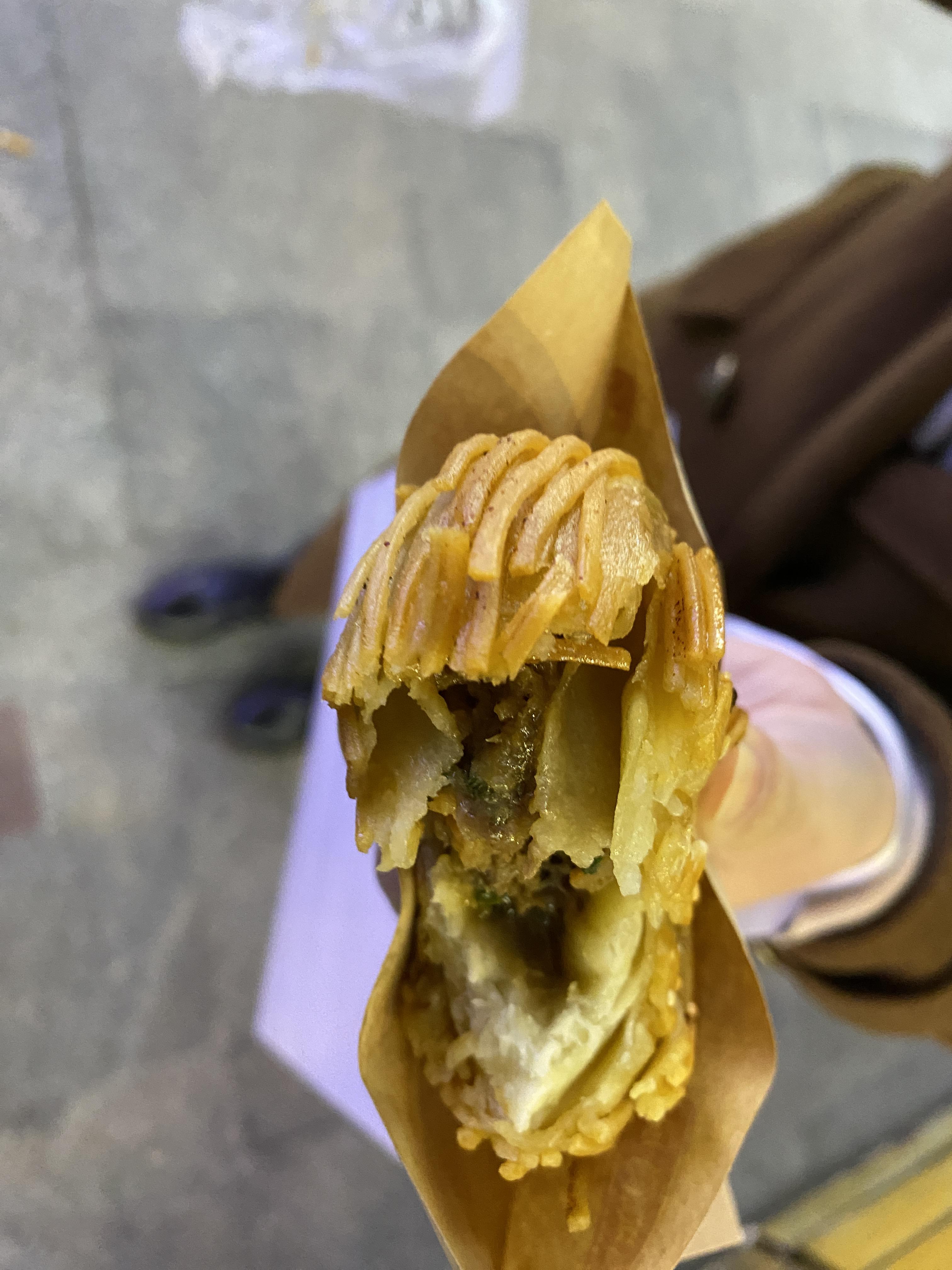 노점상에서 진쓰뉴로우빙(金丝牛肉饼, 금사우육병)을 파는데, 맛있어 보여서 사먹어 보았다. 진쓰뉴로우빙은 티벳의 전통음식으로 겉은 얇게 썰어서 바삭하게 튀긴 감자이고 속은 야채와 함께 티벳의 전통 사육소인 야크 소고기가 가득한 소고기 패티가 들어 있다. 바삭한 감자와 기름지고 따뜻한 소고기가 매우 잘 어우러져 맛있는 티벳의 전통음식이다.