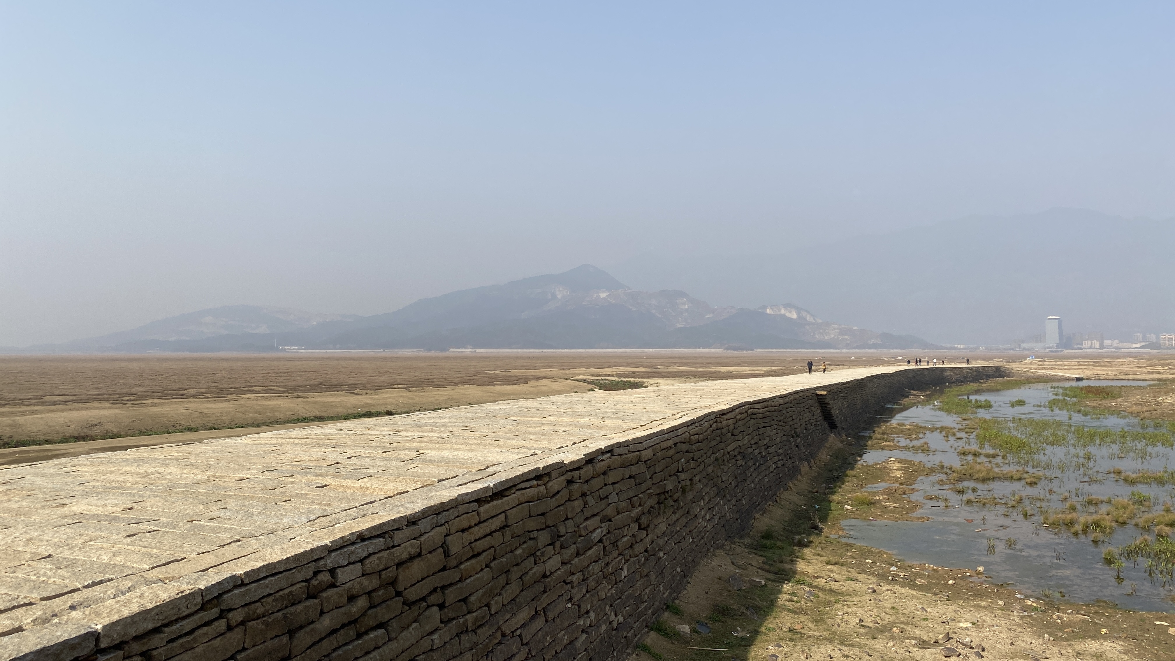 둑에서 내려와 호수 바닥을 걸어가 보았다. 저 멀리 루오씽둔이 보인다.