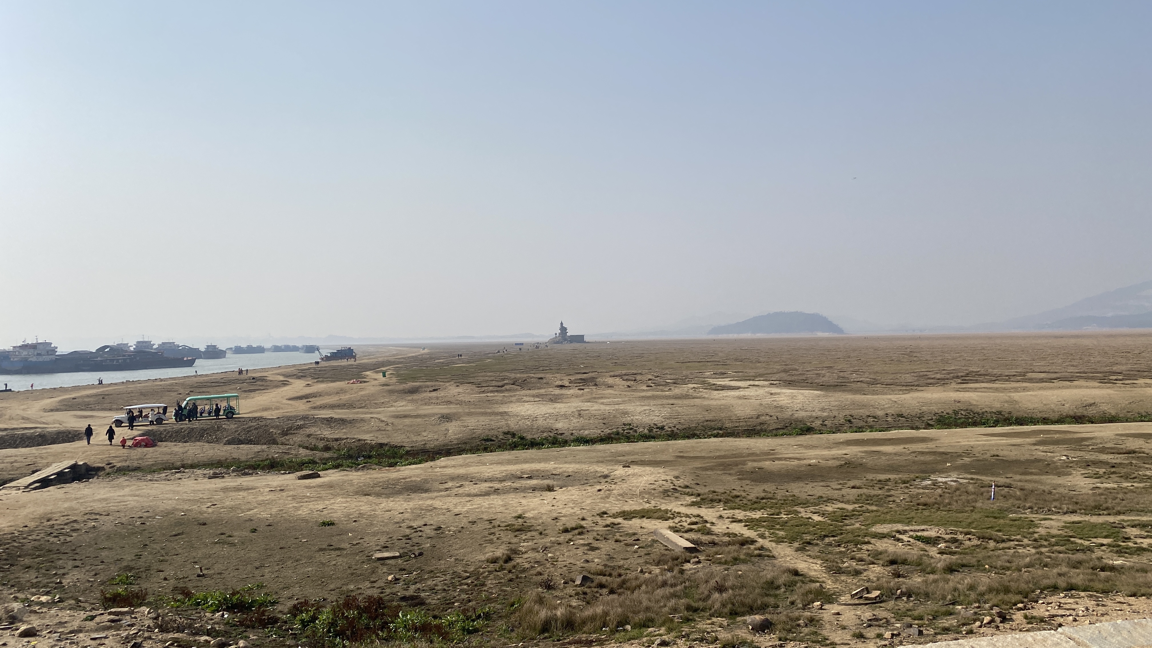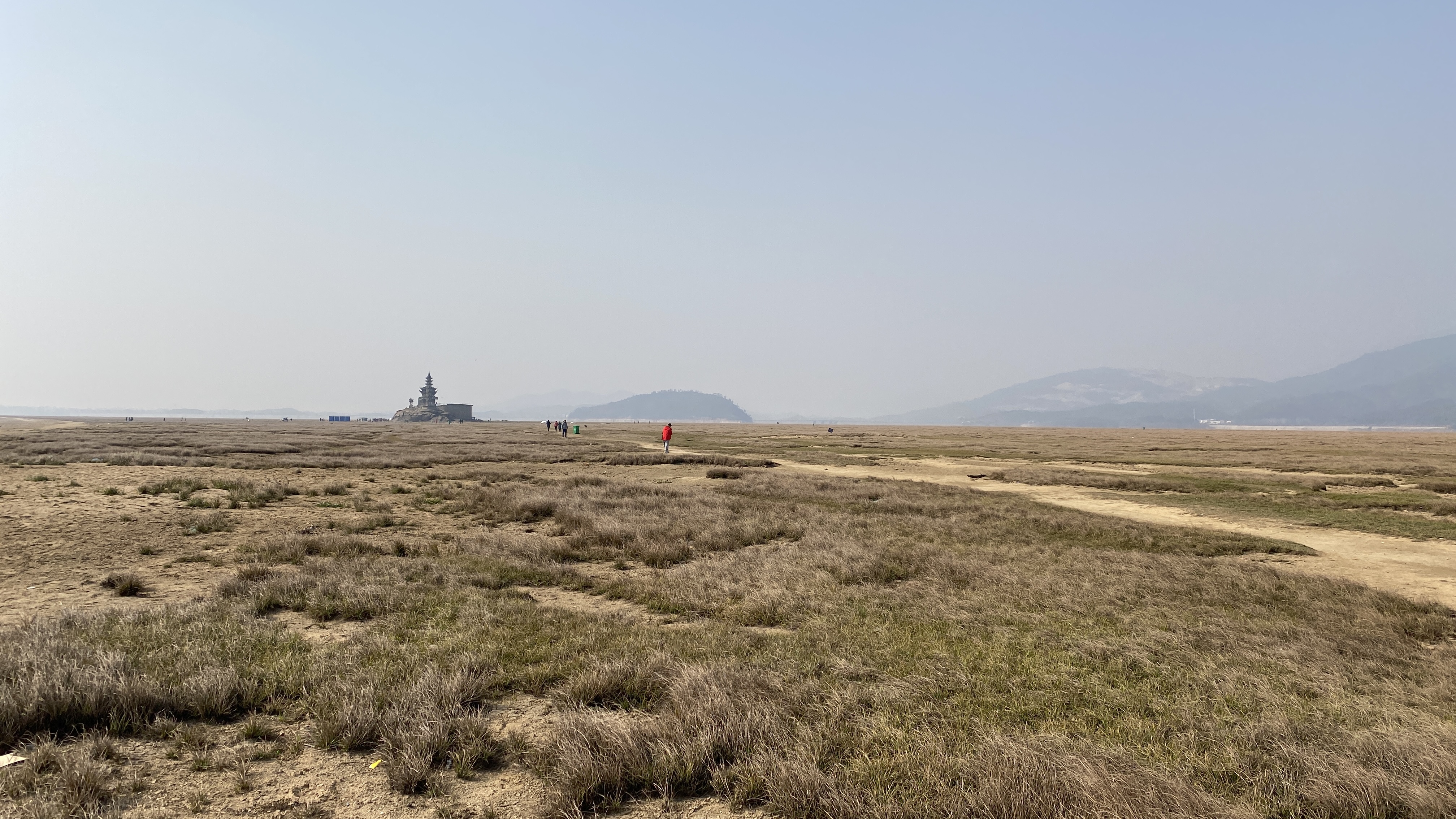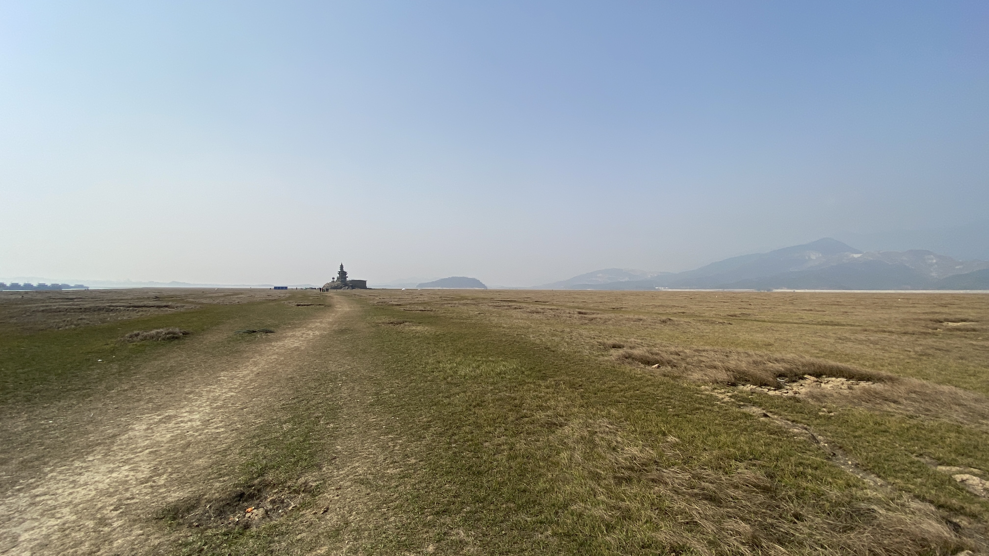 포양후의 주요 관광지라고 하지만 제대로 된 주차장도 없다는게 신기했다. 호수의 제방을 따라 늘어져 있는 비포장도로에 다른 차들과 같이 대충 주차를 하고 루오씽둔으로 걸어가 보았다. 물이 빠지는 시기라서 바닥이 들어났다고 해도 어느정도 질척거리거나 수분이 있는 땅을 예상했는데, 너무 모래바람이 날리는 건조한 바닥이라 약간 놀랐다.