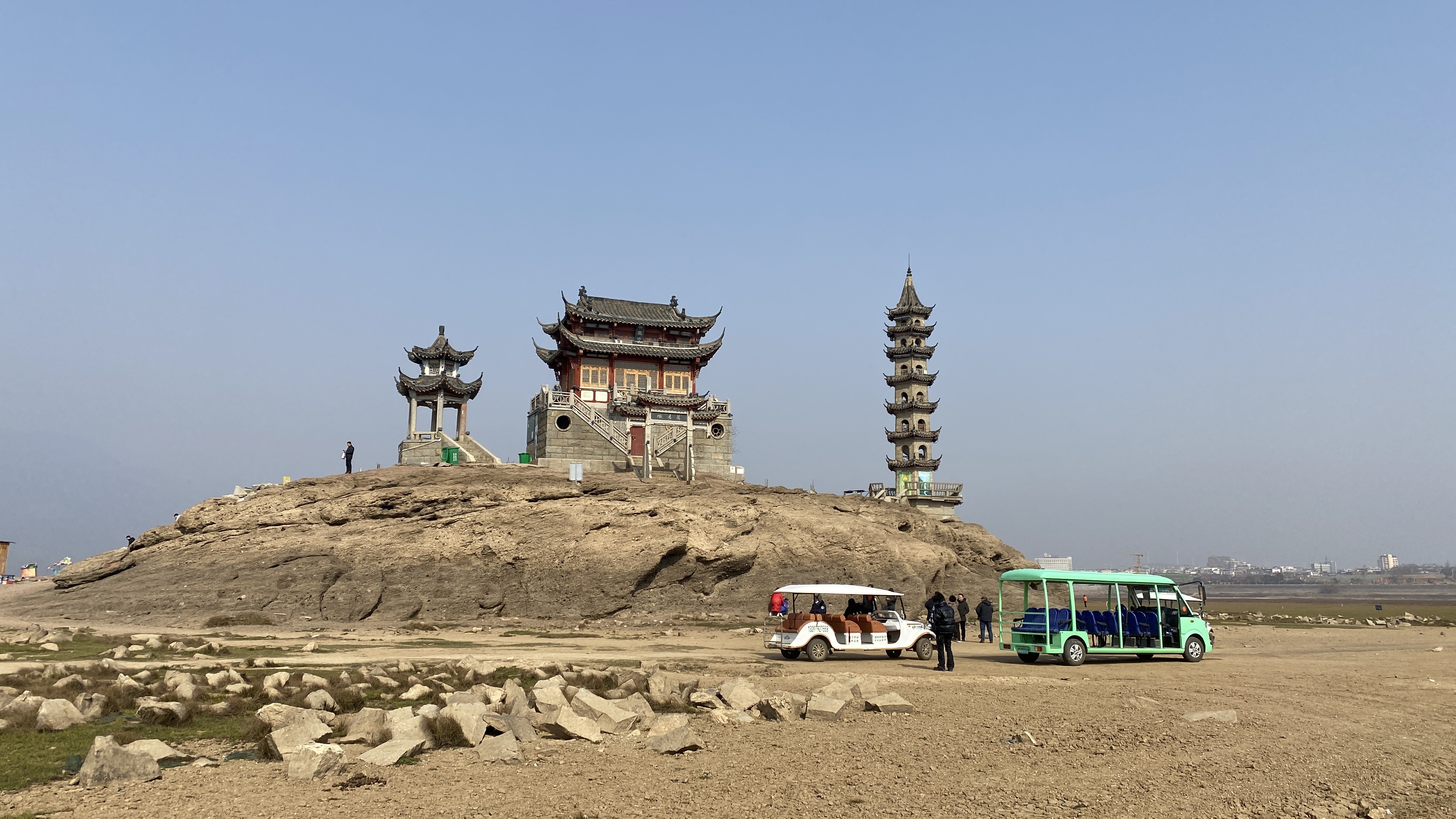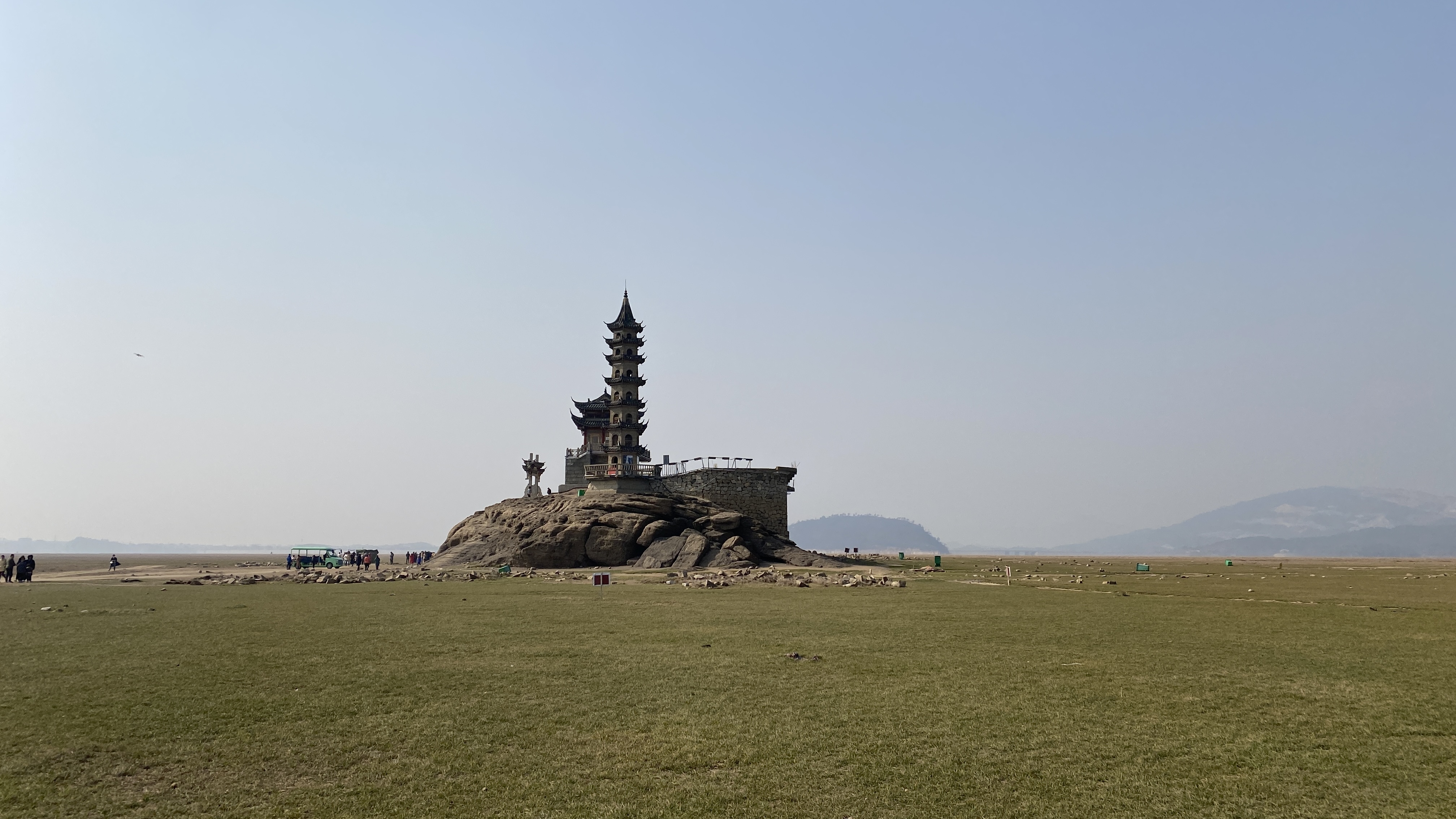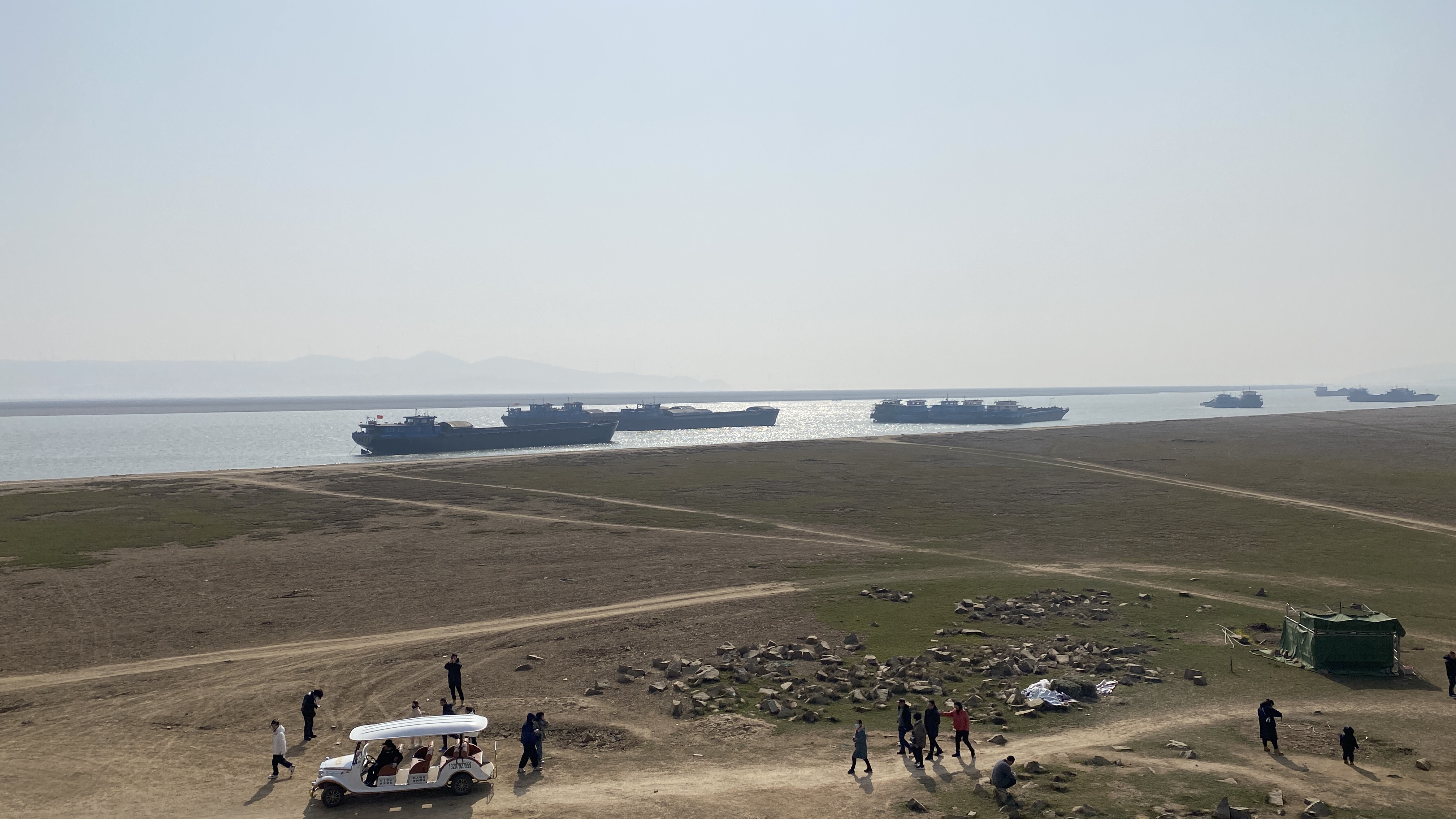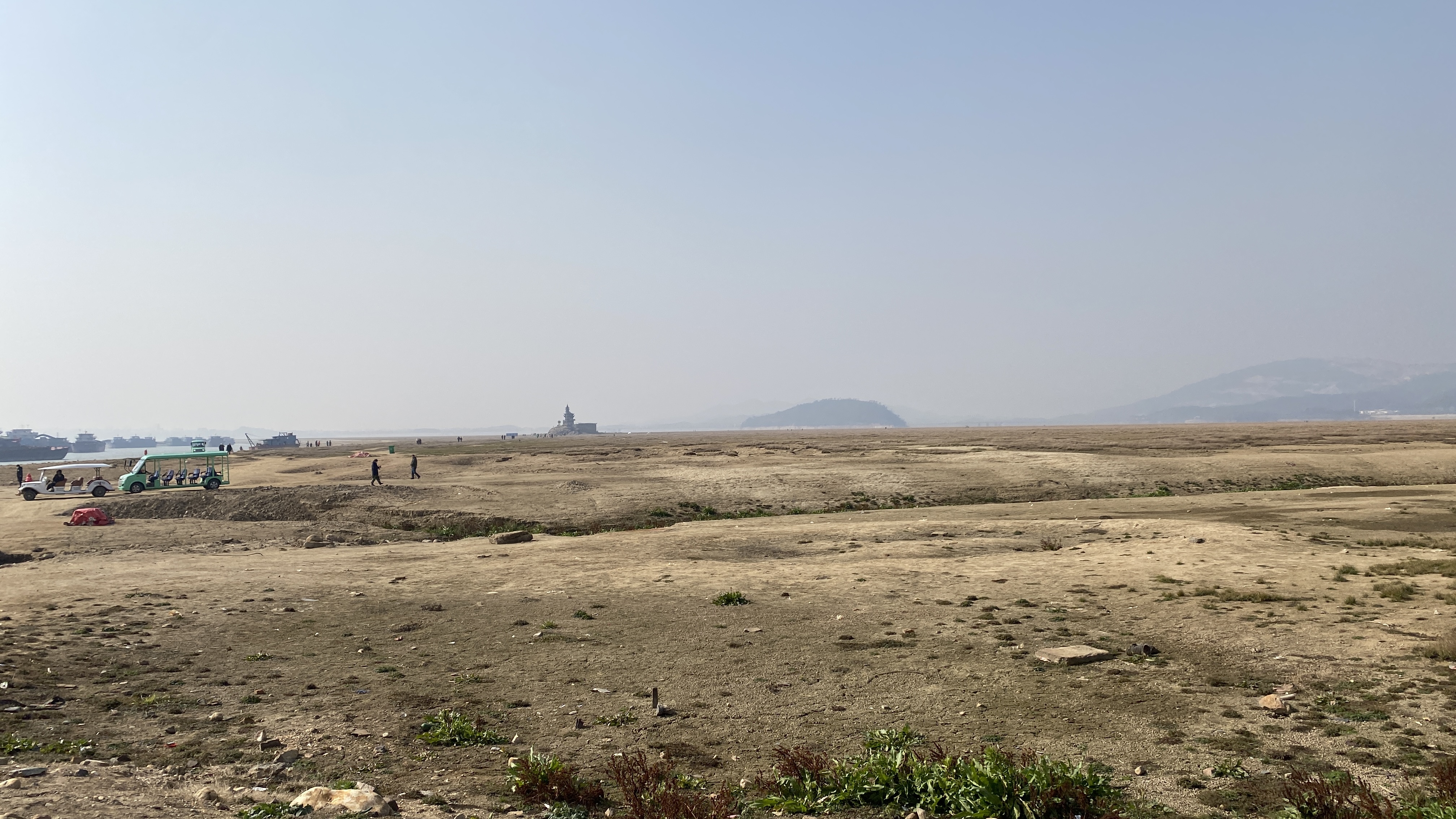 포양후의 주요 관광지라고 하지만 제대로 된 주차장도 없다는게 신기했다. 호수의 제방을 따라 늘어져 있는 비포장도로에 다른 차들과 같이 대충 주차를 하고 루오씽둔으로 걸어가 보았다. 물이 빠지는 시기라서 바닥이 들어났다고 해도 어느정도 질척거리거나 수분이 있는 땅을 예상했는데, 너무 모래바람이 날리는 건조한 바닥이라 약간 놀랐다.