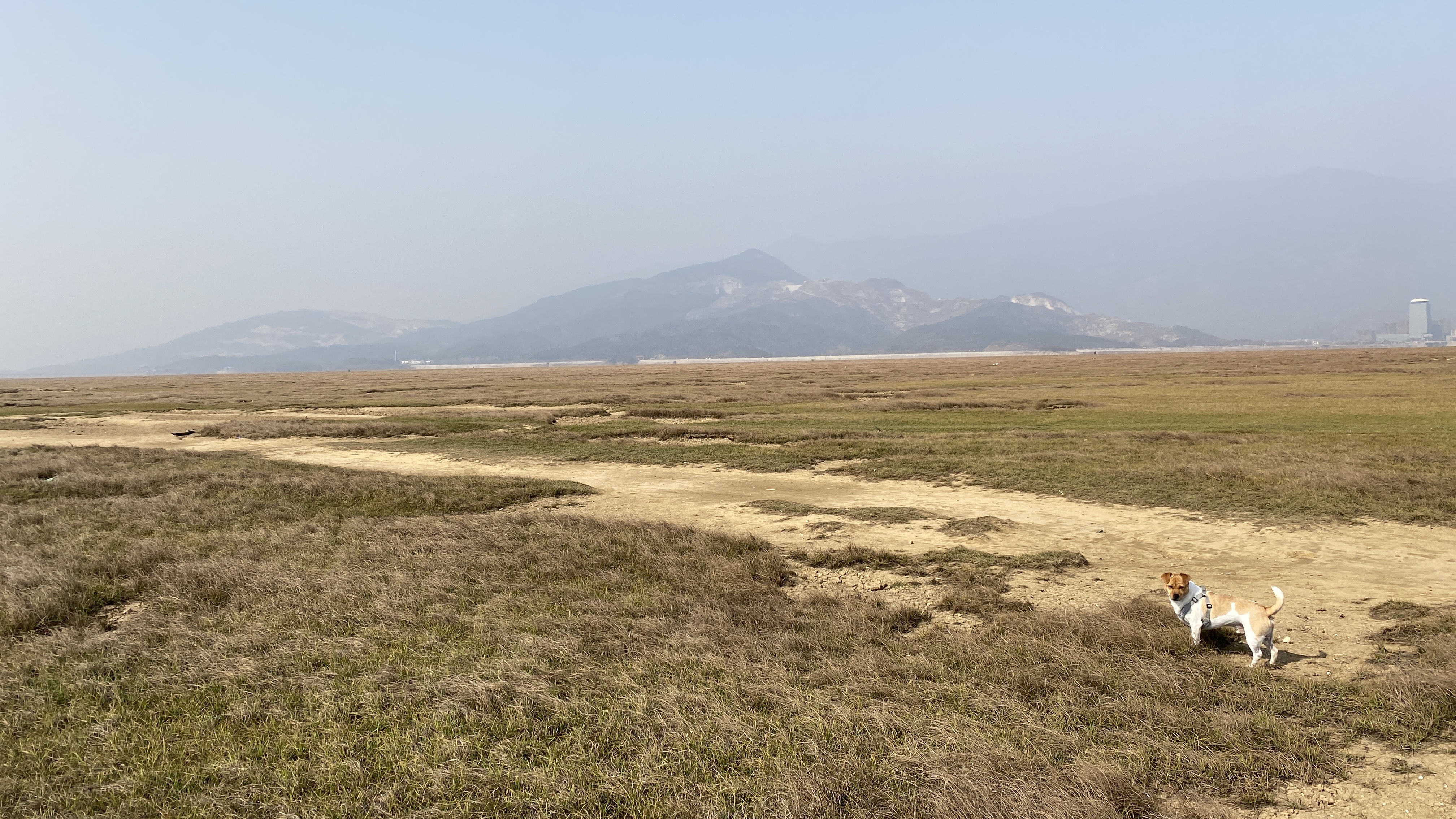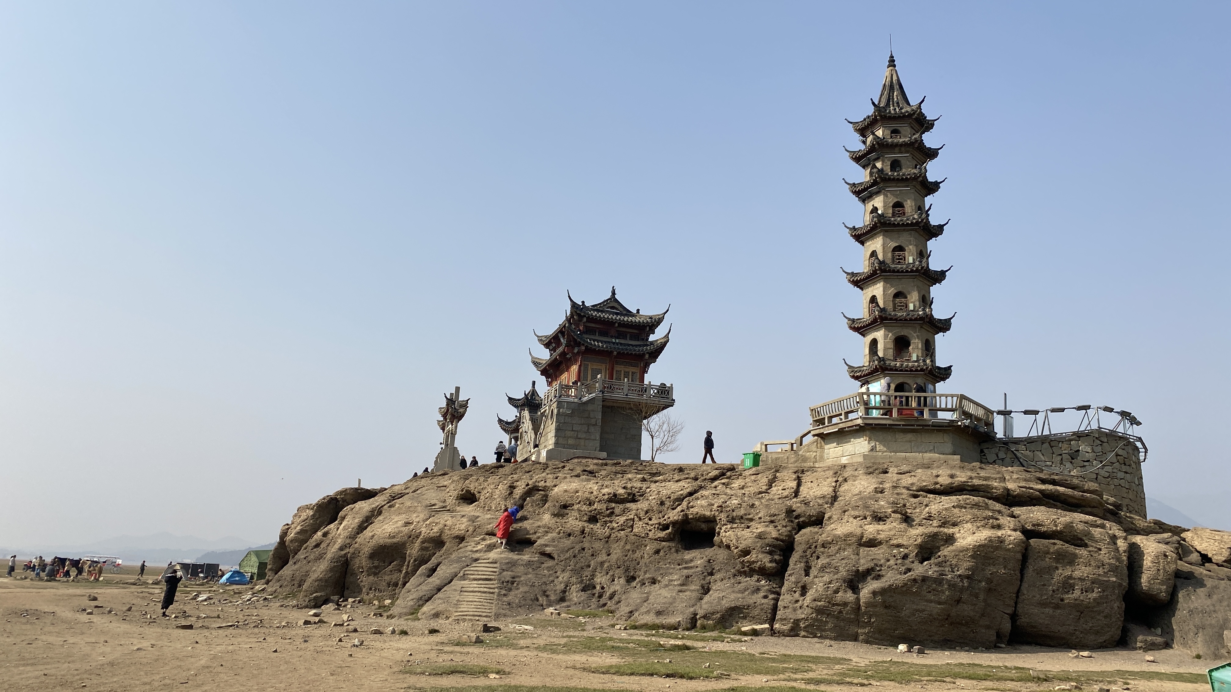 둑에서 내려와 호수 바닥을 걸어가 보았다. 저 멀리 루오씽둔이 보인다.