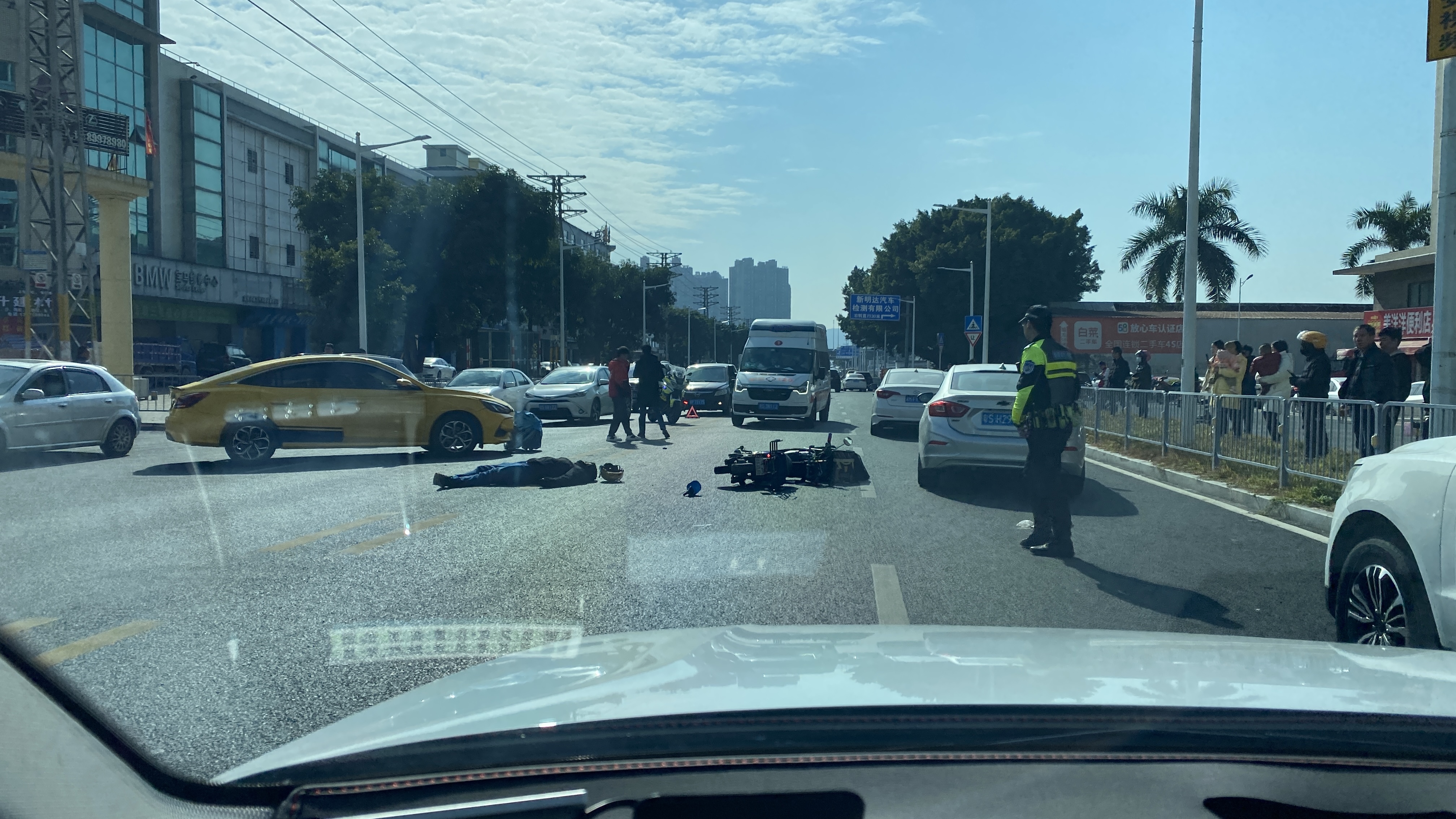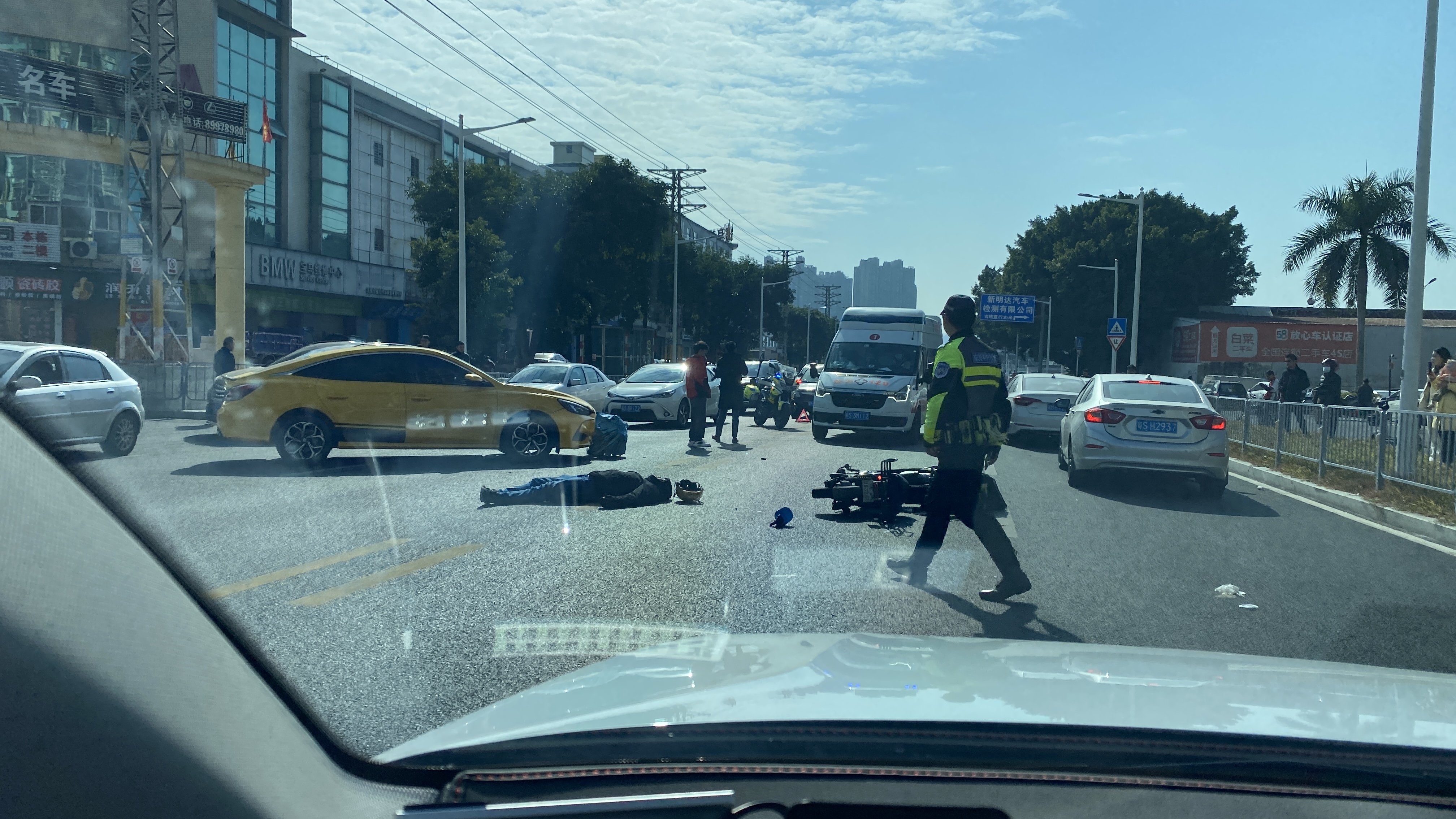 상황상 왼쪽의 노란색 차량이 골목에서 나와 주도로의 반대편 차선으로 진입하다가 맞은편에서 오던 전동스쿠터하고 부딪힌 것으로 보인다. 이미 경찰도 와 있고 막 앰뷸런스도 도착한 상황.