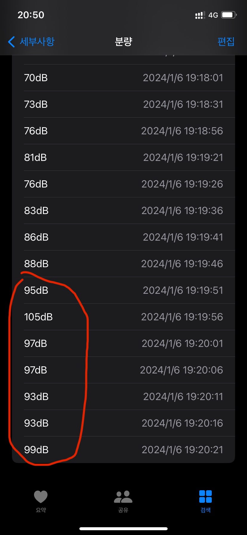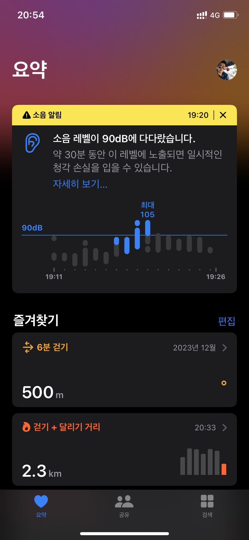 어제 자전거를 타고 와서 피곤해서 자다가 너무 시끄러워서 깼는데, 아파트 외부에서 행사 중이었다. 옆에 있는 다른 아파트 단지에서 아이들을 위한 행사를 하는 듯 한데, 아파트 건물 사이가 계곡처럼 생긴 곳에 행사를 하다보니 소리가 서로 반사가 되면서 증폭되어 상층에서는 정말 크게 들렸다. 안방의 침대에서 자고 있었지만, 애플워치에서 105dB로 사상 최고의 소음이 발생해서 경고를 주기까지 하였다.