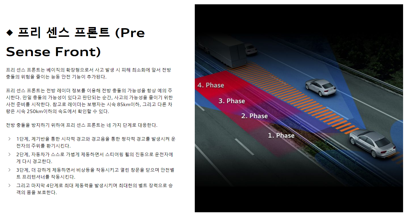 아우디 차량에는 아우디 프리 센스(Audi pre sense)라는 사고 방지 시스템이 있다. 예전에 이 기능의 감도를 올려놓았더니 가끔 운전하다가 앞차나 장애물과 가까워지는데 속도가 줄지 않으면 경고음이 울리는 경우가 있어서 다시 Medium으로 해 놓고 쓰고 있었다.