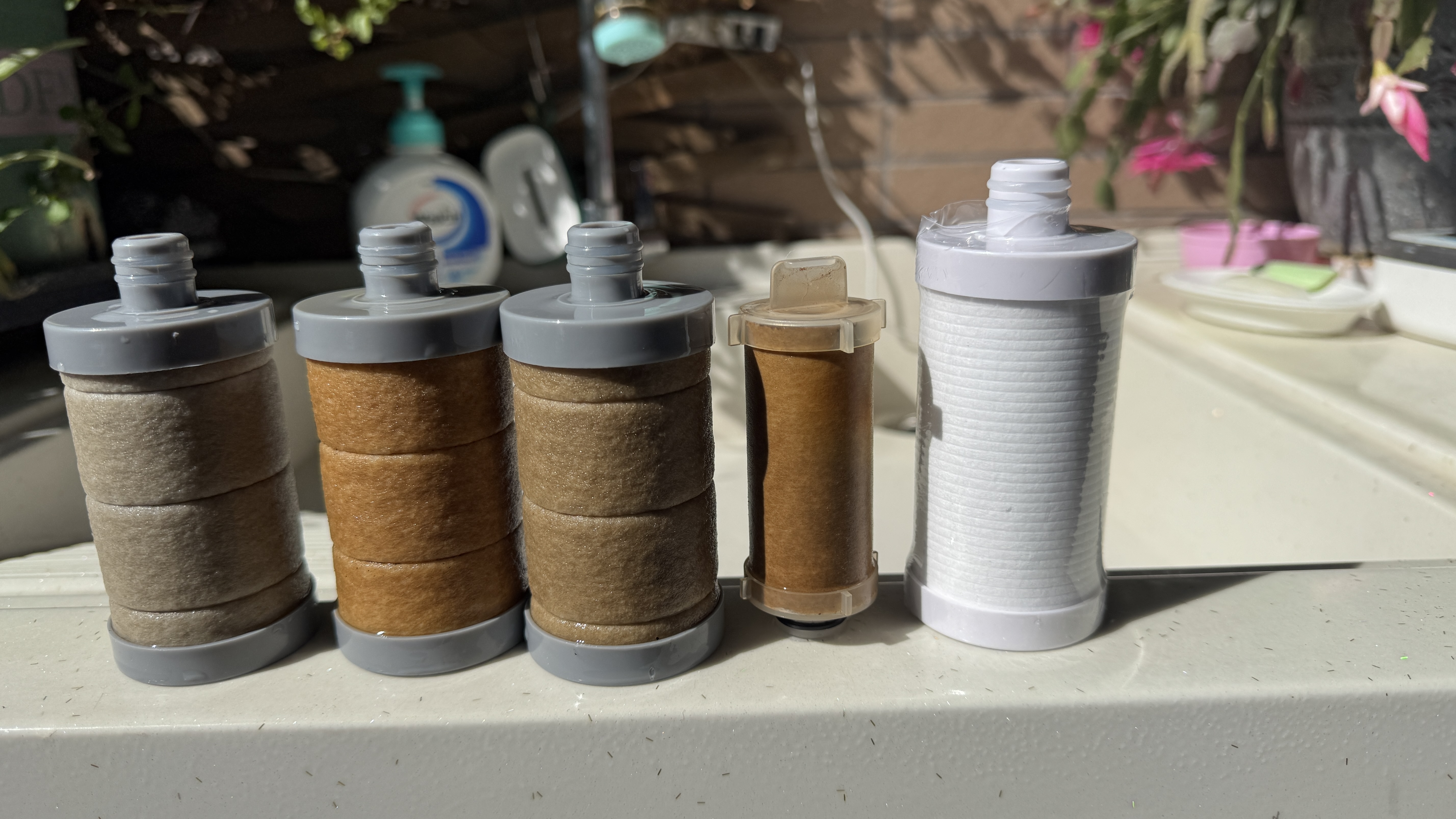 왼쪽 세개의 필터는 3주 약간 넘게 사용한 필터인데, 왼쪽 세개는 온수용 보일러와 싱크대용 냉수와 온수에 사용하던 필터들이고 작은 것은 1년정도 비데에 사용하던 필터이다. 마지막은 색 비교를 위해서 놓은 새 필터이다.